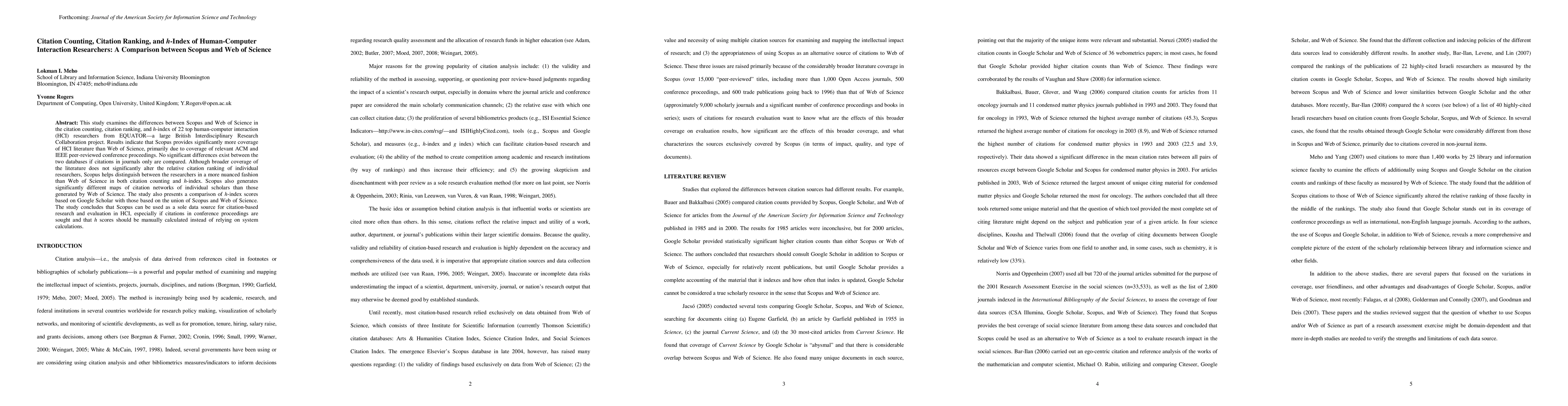 This study compares Scopus and Web of Science for citation metrics in human-computer interaction research, finding Scopus offers broader literature coverage, especially for conference proceedings. While Scopus and Web of Science show similar results for journal citations, Scopus provides more nuanced distinctions in citation counts and h-index, suggesting it as a preferable sole data source for HCI citation analysis.