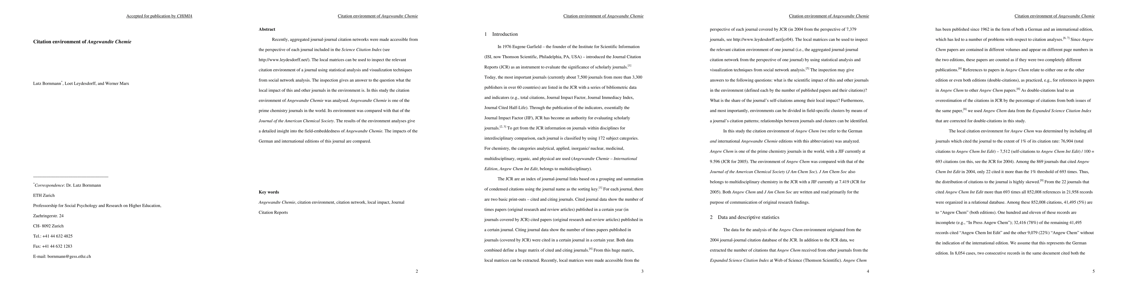 Recently, aggregated journal-journal citation networks were made accessible from the perspective of each journal included in the Science Citation Index see (http://www.leydesdorff.net/). The local matrices can be used to inspect the relevant citation environment of a journal using statistical analysis and visualization techniques from social network analysis. The inspection gives an answer to the question what the local impact of this and other journals in the environment is. In this study the citation environment of Angewandte Chemie was analysed. Angewandte Chemie is one of the prime chemistry journals in the world. Its environment was compared with that of the Journal of the American Chemical Society. The results of the environment analyses give a detailed insight into the field-embeddedness of Angewandte Chemie. The impacts of the German and international editions of this journal are compared.
