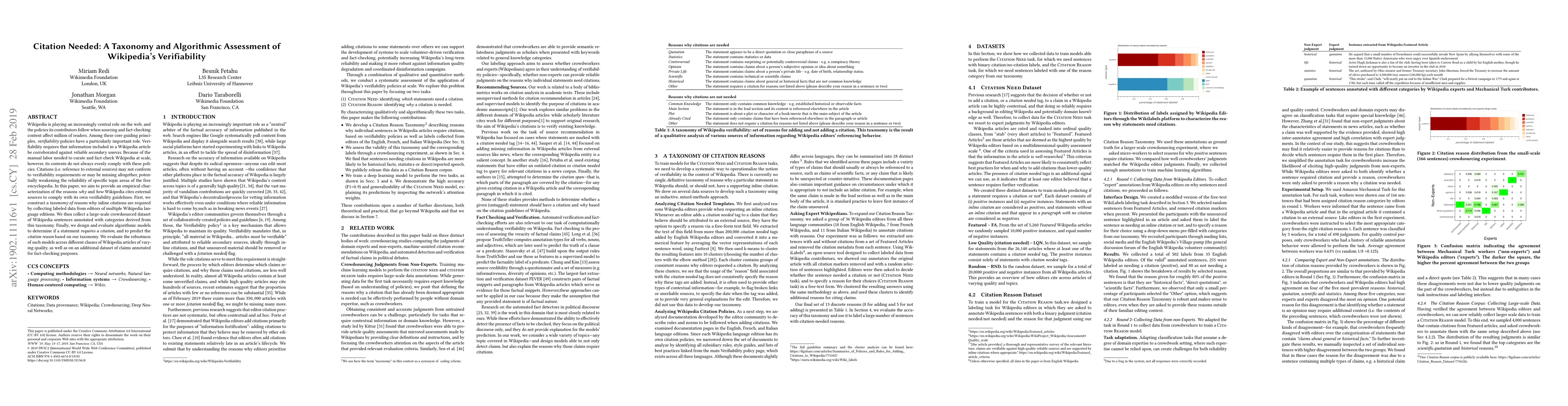 This paper examines Wikipedia's verifiability policies and develops a taxonomy to understand why citations are required, as well as algorithmic models to predict citation needs and reasons.