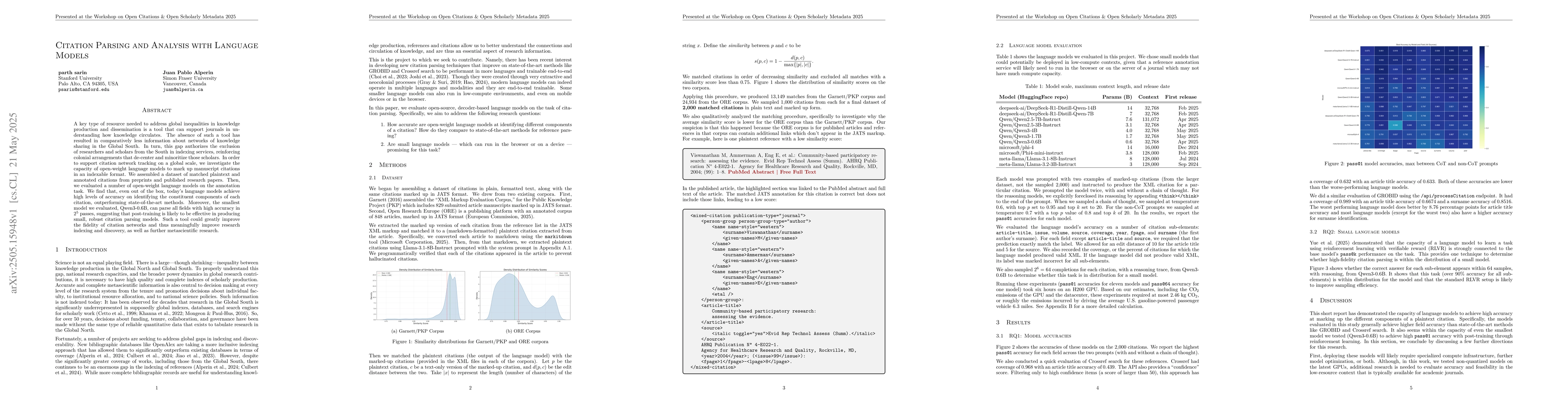 A key type of resource needed to address global inequalities in knowledge production and dissemination is a tool that can support journals in understanding how knowledge circulates. The absence of such a tool has resulted in comparatively less information about networks of knowledge sharing in the Global South. In turn, this gap authorizes the exclusion of researchers and scholars from the South in indexing services, reinforcing colonial arrangements that de-center and minoritize those scholars. In order to support citation network tracking on a global scale, we investigate the capacity of open-weight language models to mark up manuscript citations in an indexable format. We assembled a dataset of matched plaintext and annotated citations from preprints and published research papers. Then, we evaluated a number of open-weight language models on the annotation task. We find that, even out of the box, today's language models achieve high levels of accuracy on identifying the constituent components of each citation, outperforming state-of-the-art methods. Moreover, the smallest model we evaluated, Qwen3-0.6B, can parse all fields with high accuracy in $2^5$ passes, suggesting that post-training is likely to be effective in producing small, robust citation parsing models. Such a tool could greatly improve the fidelity of citation networks and thus meaningfully improve research indexing and discovery, as well as further metascientific research.
