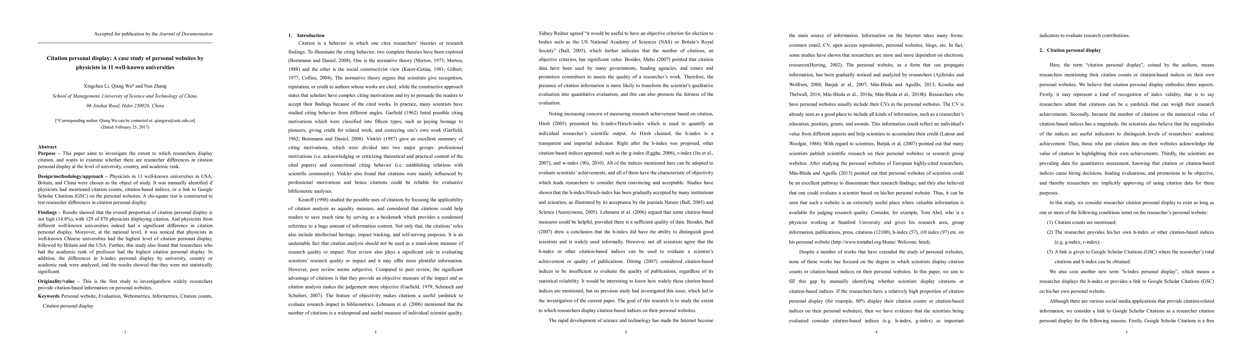 This study examines citation display on personal websites of 870 physicists from 11 renowned universities in the USA, Britain, and China, finding only 14.8% do so, with significant variation by university, country, and academic rank. Professors displayed citations most often, but h-index display differences weren't statistically significant.