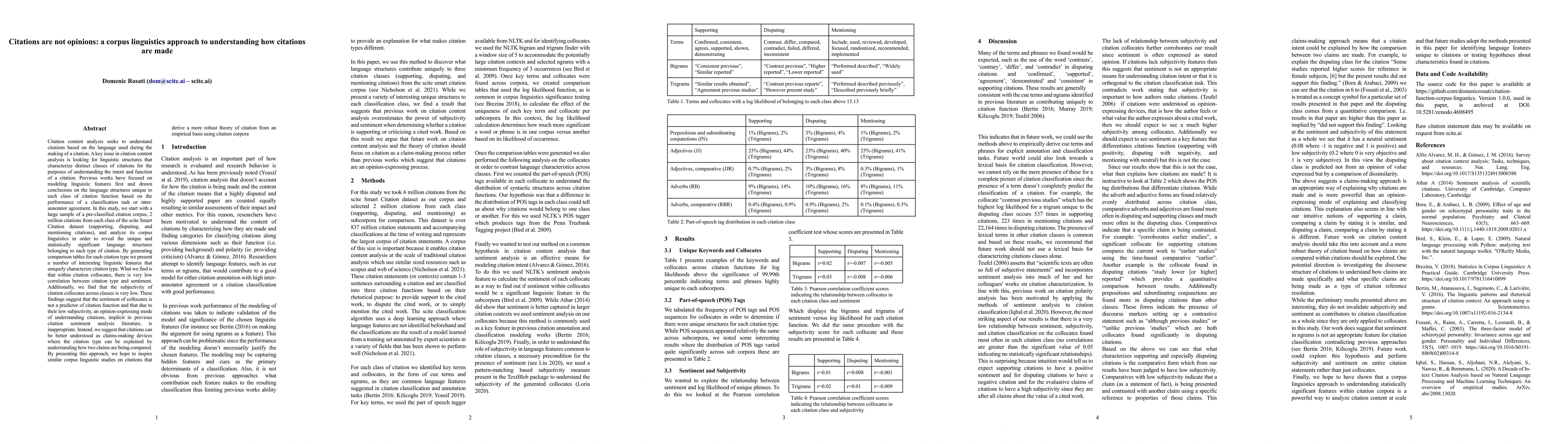 This study uses corpus linguistics to analyze 4 million pre-classified citations, revealing unique language structures for different citation types (supporting, disputing, mentioning). It finds low correlation between citation type and sentiment, suggesting that citations should be viewed as claims-making devices rather than opinion expressions.