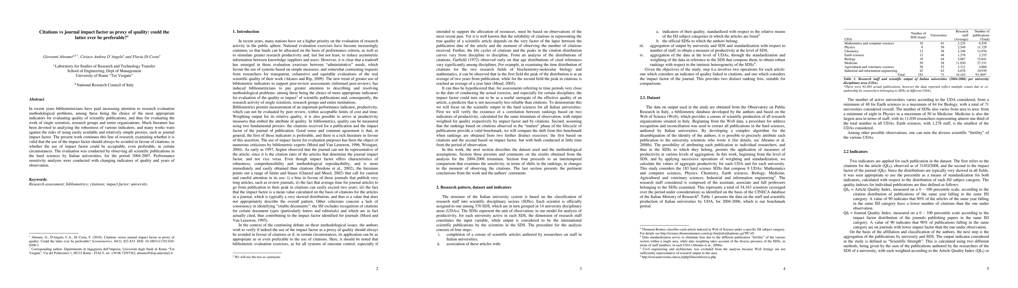This paper examines the debate over the use of journal impact factor versus citations as indicators of scientific publication quality, analyzing whether the impact factor could be preferable in certain contexts. The study evaluates Italian universities' hard science publications from 2004-2007, employing performance sensitivity analyses to assess varying indicators and observation periods.