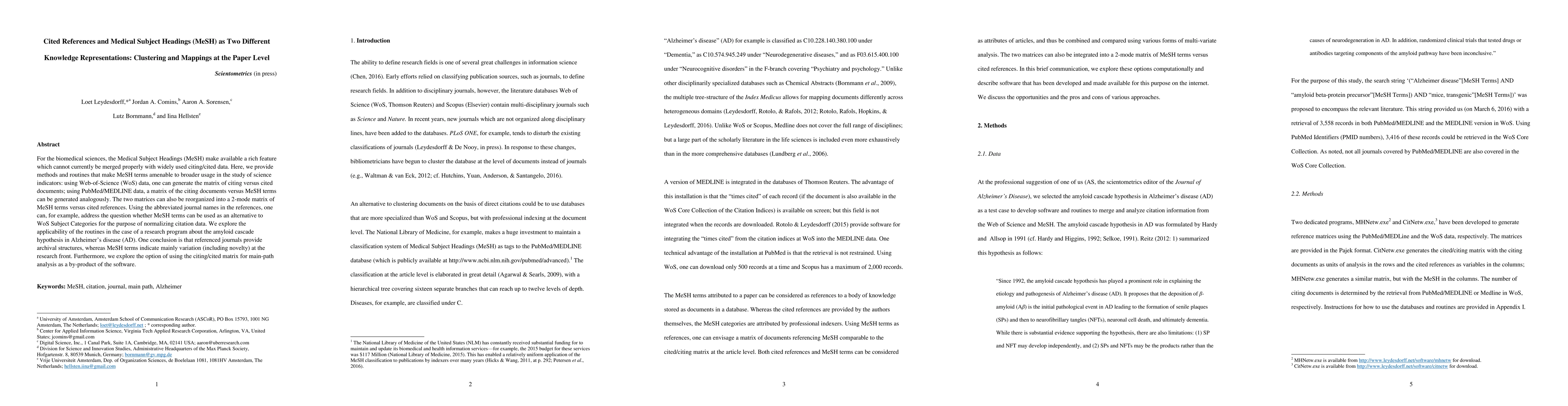 For the biomedical sciences, the Medical Subject Headings (MeSH) make available a rich feature which cannot currently be merged properly with widely used citing/cited data. Here, we provide methods and routines that make MeSH terms amenable to broader usage in the study of science indicators: using Web-of-Science (WoS) data, one can generate the matrix of citing versus cited documents; using PubMed/MEDLINE data, a matrix of the citing documents versus MeSH terms can be generated analogously. The two matrices can also be reorganized into a 2-mode matrix of MeSH terms versus cited references. Using the abbreviated journal names in the references, one can, for example, address the question whether MeSH terms can be used as an alternative to WoS Subject Categories for the purpose of normalizing citation data. We explore the applicability of the routines in the case of a research program about the amyloid cascade hypothesis in Alzheimer's disease (AD). One conclusion is that referenced journals provide archival structures, whereas MeSH terms indicate mainly variation (including novelty) at the research front. Furthermore, we explore the option of using the citing/cited matrix for main-path analysis as a by-product of the software.