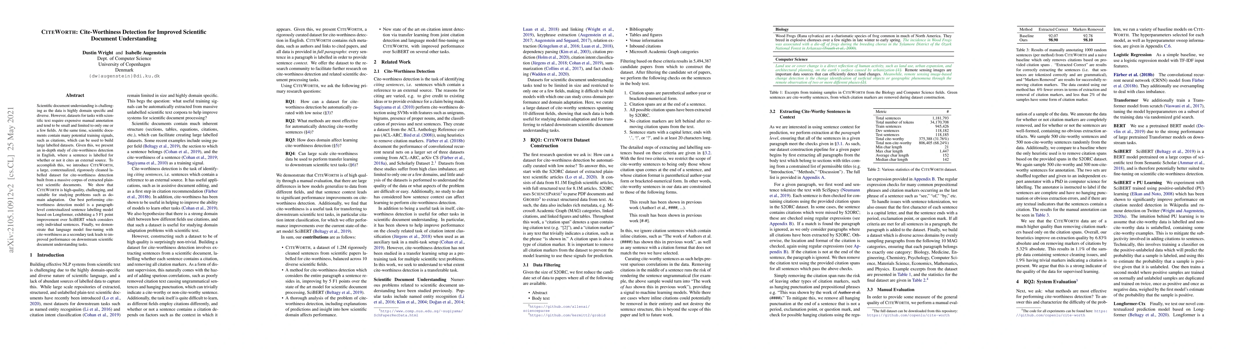 The paper introduces CiteWorth, a large, contextualized dataset for detecting cite-worthiness in scientific documents, aiming to improve scientific document understanding. The best model, based on Longformer, shows a 5 F1 point improvement over SciBERT, and fine-tuning with cite-worthiness enhances performance on downstream tasks.