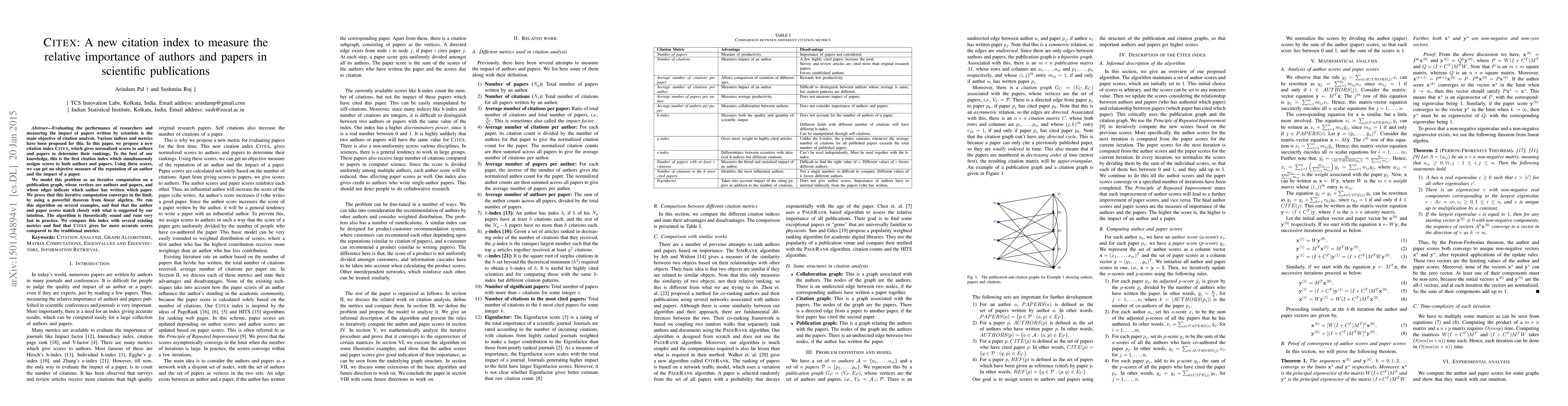 Evaluating the performance of researchers and measuring the impact of papers written by scientists is the main objective of citation analysis. Various indices and metrics have been proposed for this. In this paper, we propose a new citation index CITEX, which gives normalized scores to authors and papers to determine their rankings. To the best of our knowledge, this is the first citation index which simultaneously assigns scores to both authors and papers. Using these scores, we can get an objective measure of the reputation of an author and the impact of a paper. We model this problem as an iterative computation on a publication graph, whose vertices are authors and papers, and whose edges indicate which author has written which paper. We prove that this iterative computation converges in the limit, by using a powerful theorem from linear algebra. We run this algorithm on several examples, and find that the author and paper scores match closely with what is suggested by our intuition. The algorithm is theoretically sound and runs very fast in practice. We compare this index with several existing metrics and find that CITEX gives far more accurate scores compared to the traditional metrics.