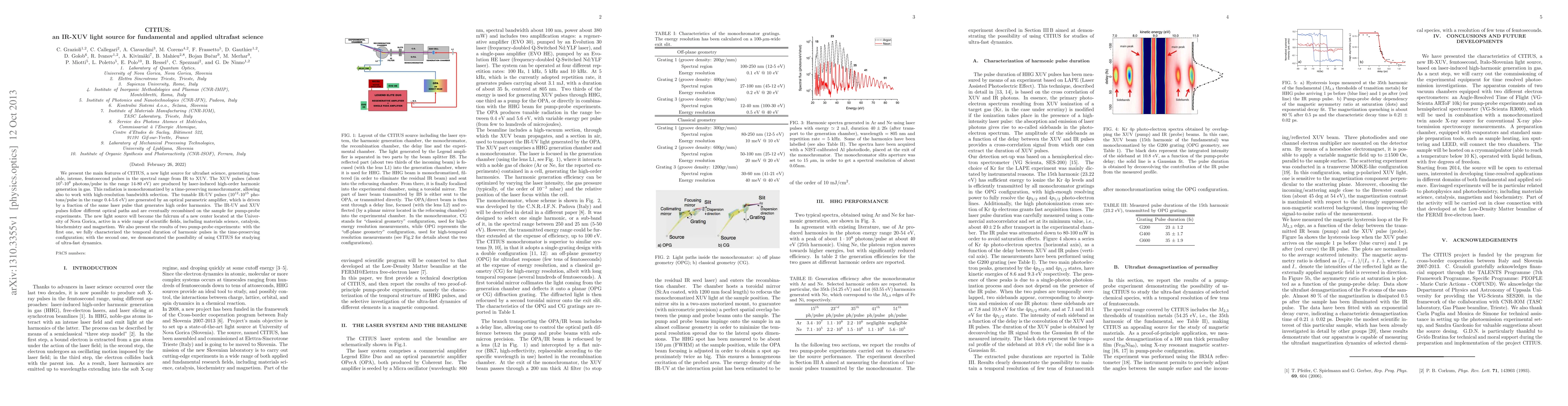 We present the main features of CITIUS, a new light source for ultrafast science, generating tunable, intense, femtosecond pulses in the spectral range from IR to XUV. The XUV pulses (about 10^5-10^8 photons/pulse in the range 14-80 eV) are produced by laser-induced high-order harmonic generation in gas. This radiation is monochromatized by a time-preserving monochromator, allowing also to work with high-resolution bandwidth selection. The tunable IR-UV pulses (10^{12}-10^{15} photons/pulse in the range 0.4-5.6 eV) are generated by an optical parametric amplifier, which is driven by a fraction of the same laser pulse that generates high order harmonics. The IR-UV and XUV pulses follow different optical paths and are eventually recombined on the sample for pump-probe experiments. The new light source will become the fulcrum of a new center located at the University of Nova Gorica, active in a wide range of scientific fields, including materials science, catalysis, biochemistry and magnetism. We also present the results of two pump-probe experiments: with the first one, we fully characterized the temporal duration of harmonic pulses in the time-preserving configuration; with the second one, we demonstrated the possibility of using CITIUS for studying of ultra-fast dynamics.