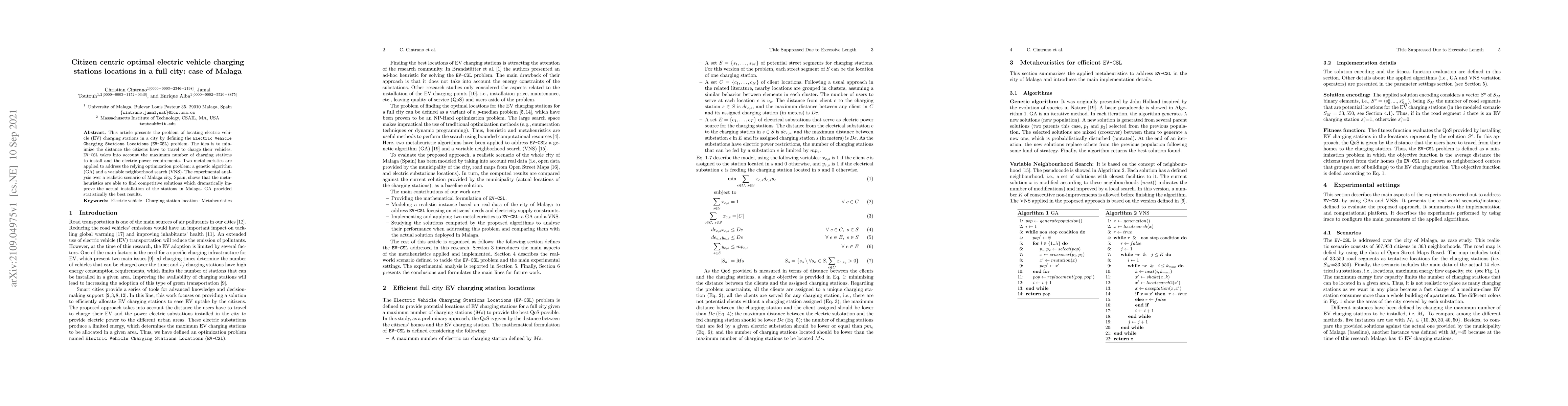 This paper addresses the optimization of electric vehicle charging station locations in Malaga to minimize citizen travel distances, employing genetic algorithms and variable neighborhood search. Experimental results demonstrate significant improvements over current installations, with genetic algorithms yielding the best outcomes.