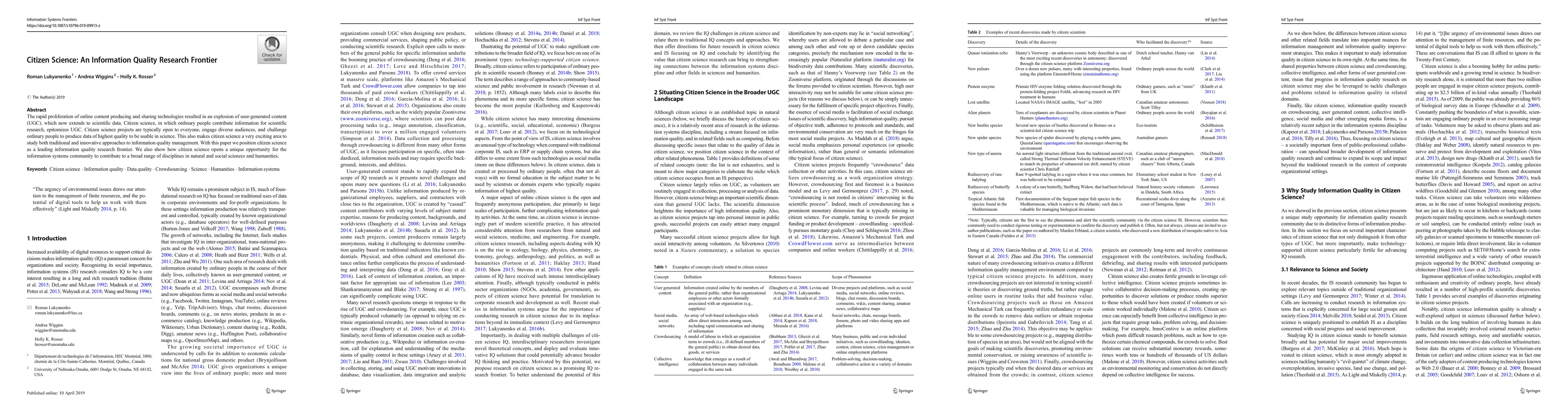 This paper explores citizen science as a frontier for information quality research, highlighting how ordinary people contribute to scientific data, and emphasizing the need for high-quality information management. It also underscores the potential for the information systems community to enhance various disciplines through citizen science initiatives.