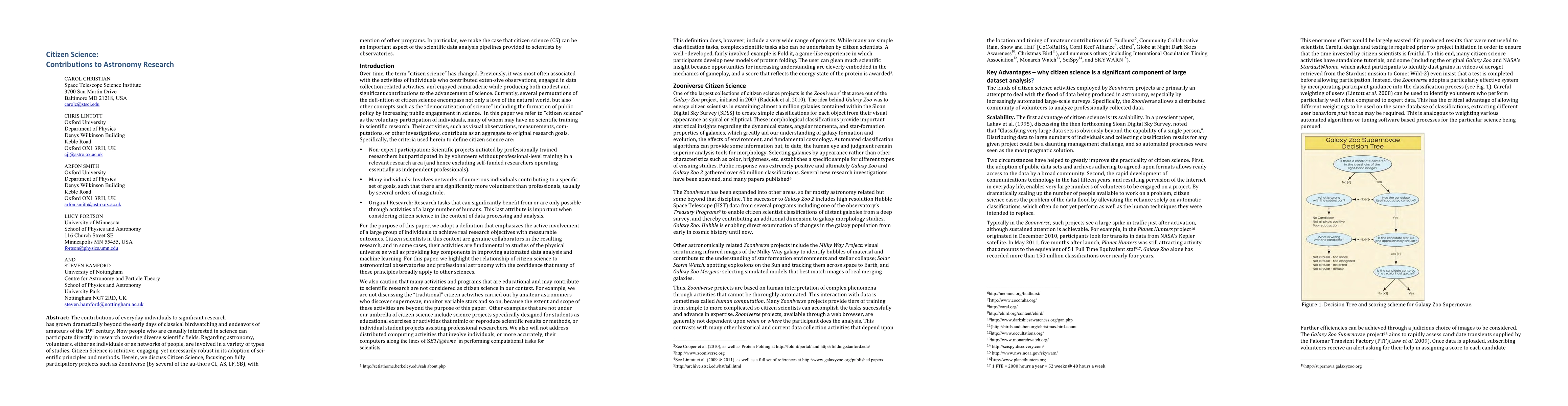 The contributions of everyday individuals to significant research has grown dramatically beyond the early days of classical birdwatching and endeavors of amateurs of the 19th century. Now people who are casually interested in science can participate directly in research covering diverse scientific fields. Regarding astronomy, volunteers, either as individuals or as networks of people, are involved in a variety of types of studies. Citizen Science is intuitive, engaging, yet necessarily robust in its adoption of sci-entific principles and methods. Herein, we discuss Citizen Science, focusing on fully participatory projects such as Zooniverse (by several of the au-thors CL, AS, LF, SB), with mention of other programs. In particular, we make the case that citizen science (CS) can be an important aspect of the scientific data analysis pipelines provided to scientists by observatories.