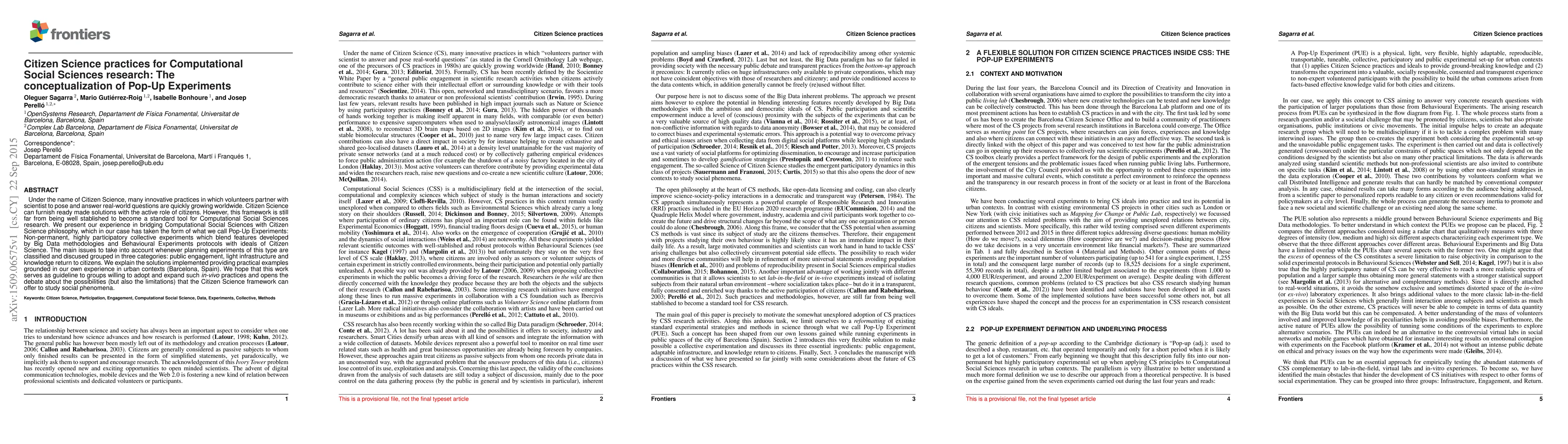 The paper discusses 'Pop-Up Experiments', a blend of Citizen Science and Computational Social Sciences, featuring non-permanent, participatory experiments. It outlines key considerations: public engagement, light infrastructure, and knowledge return to citizens, supported by urban context examples from Barcelona, Spain. The authors aim to guide researchers interested in adopting similar practices, sparking debate on Citizen Science's potential and limitations in social phenomena studies.