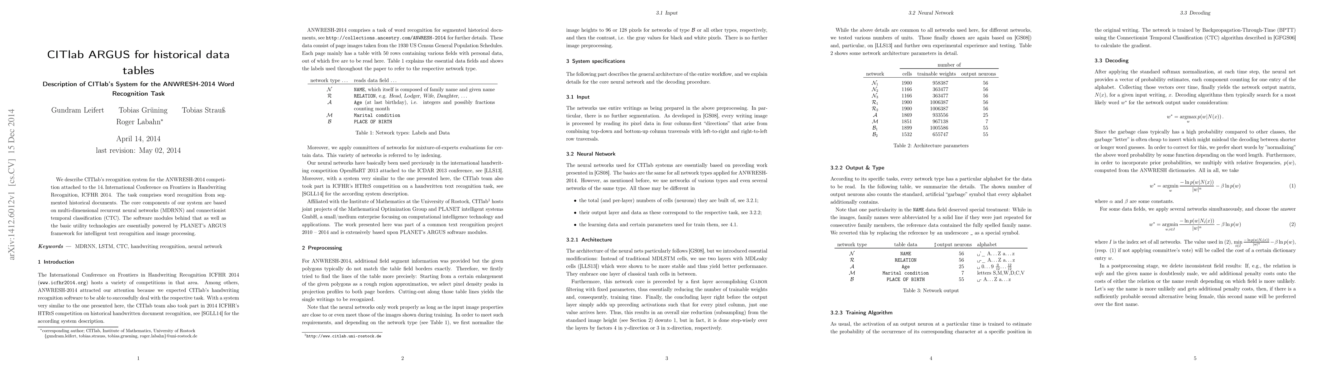 CITlab's recognition system for the ANWRESH-2014 competition, based on multi-dimensional recurrent neural networks and connectionist temporal classification, leverages PLANET's ARGUS framework for historical document word recognition. The system achieved notable results in the ICFHR 2014 competition.