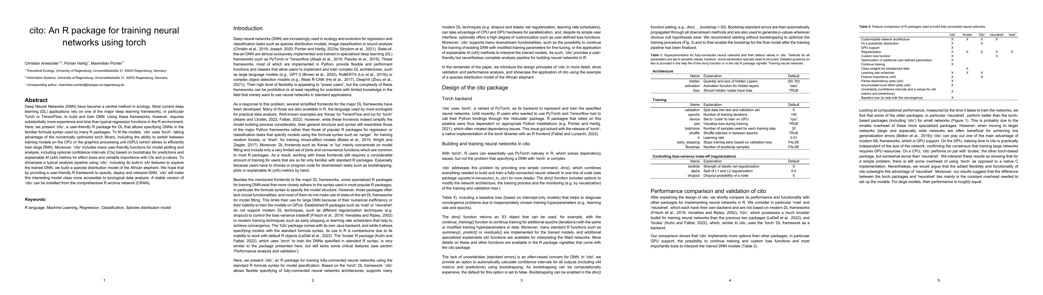 "cito" is an R package designed to simplify the training of deep neural networks using the torch library, allowing users to specify DNNs in R's familiar formula syntax. It includes functions for model plotting, analysis, and explainable AI, aiming to make deep learning more accessible for ecological data analysis.