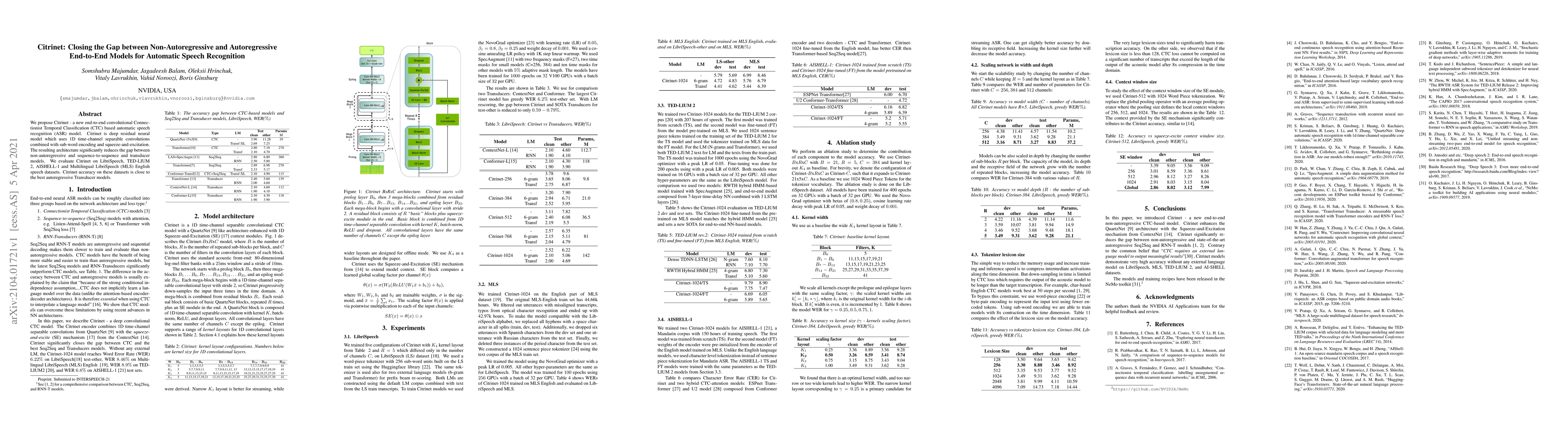 Citrinet is a novel end-to-end ASR model that combines convolutional and residual neural networks to bridge the performance gap between non-autoregressive and autoregressive models. Evaluated on multiple speech datasets, Citrinet achieves near-best autoregressive model accuracy.