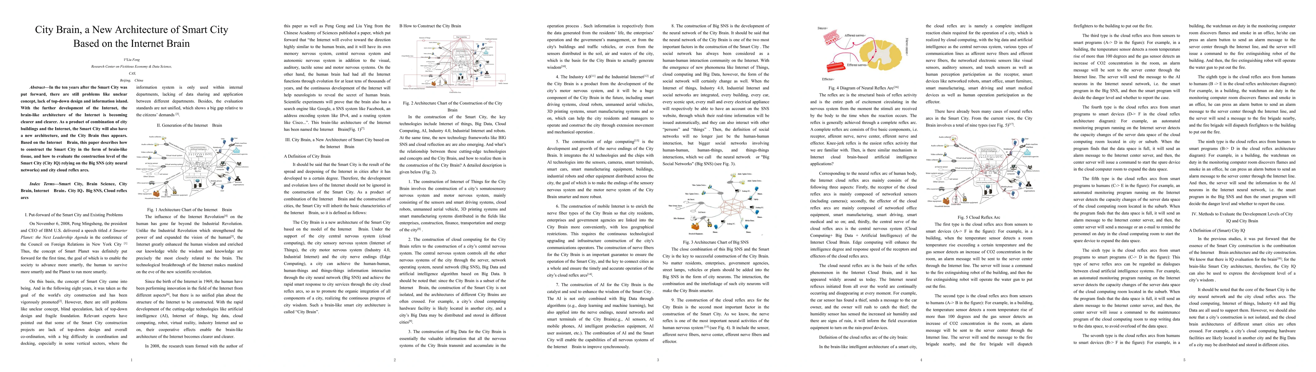 This paper introduces "City Brain," a new architecture for Smart Cities based on the Internet Brain, addressing issues like unclear concepts and lack of top-down design. It proposes a brain-like tissue structure for Smart City construction and evaluates City IQ using Big SNS and city cloud reflex arcs.