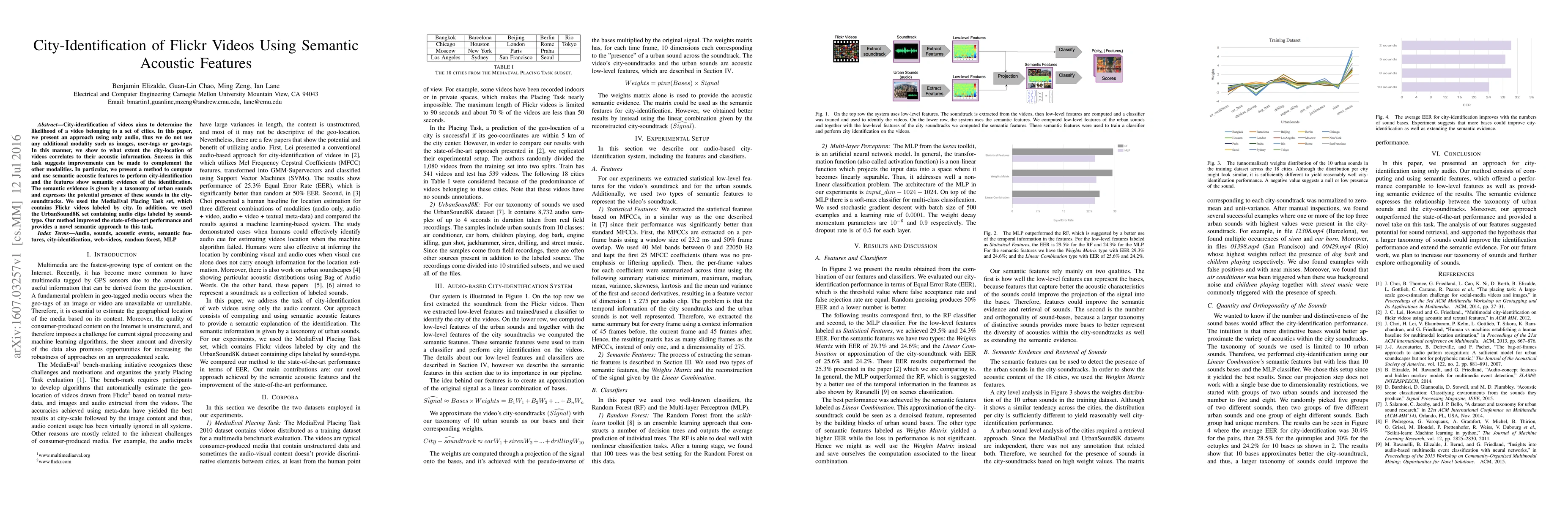 City-identification of videos aims to determine the likelihood of a video belonging to a set of cities. In this paper, we present an approach using only audio, thus we do not use any additional modality such as images, user-tags or geo-tags. In this manner, we show to what extent the city-location of videos correlates to their acoustic information. Success in this task suggests improvements can be made to complement the other modalities. In particular, we present a method to compute and use semantic acoustic features to perform city-identification and the features show semantic evidence of the identification. The semantic evidence is given by a taxonomy of urban sounds and expresses the potential presence of these sounds in the city- soundtracks. We used the MediaEval Placing Task set, which contains Flickr videos labeled by city. In addition, we used the UrbanSound8K set containing audio clips labeled by sound- type. Our method improved the state-of-the-art performance and provides a novel semantic approach to this task
