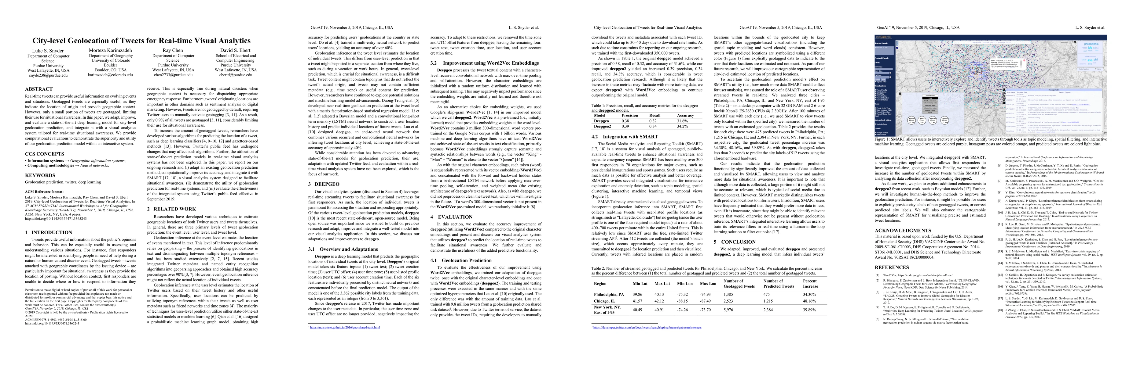 This paper develops a deep learning model for city-level geolocation prediction of tweets, enhancing real-time situational awareness. It integrates the model into a visual analytics system and demonstrates its effectiveness through computational evaluations.