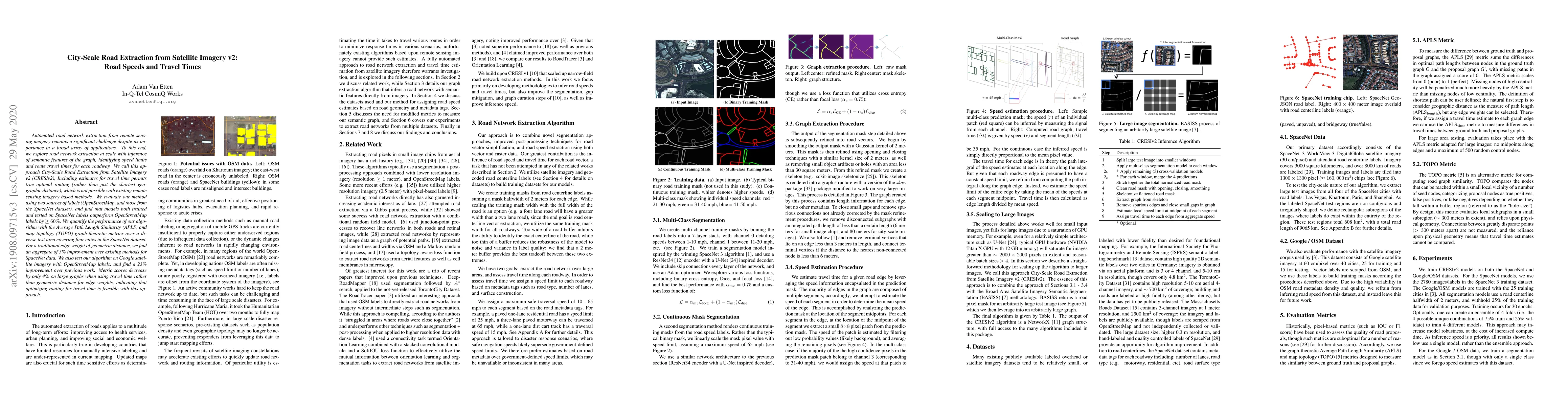 This paper presents City-Scale Road Extraction from Satellite Imagery v2 (CRESIv2), an advanced method for automated road network extraction from satellite imagery, which infers speed limits and route travel times. The approach outperforms existing methods by 5% for SpaceNet data and 23% for Google satellite imagery, enabling optimal routing based on travel time rather than just distance.