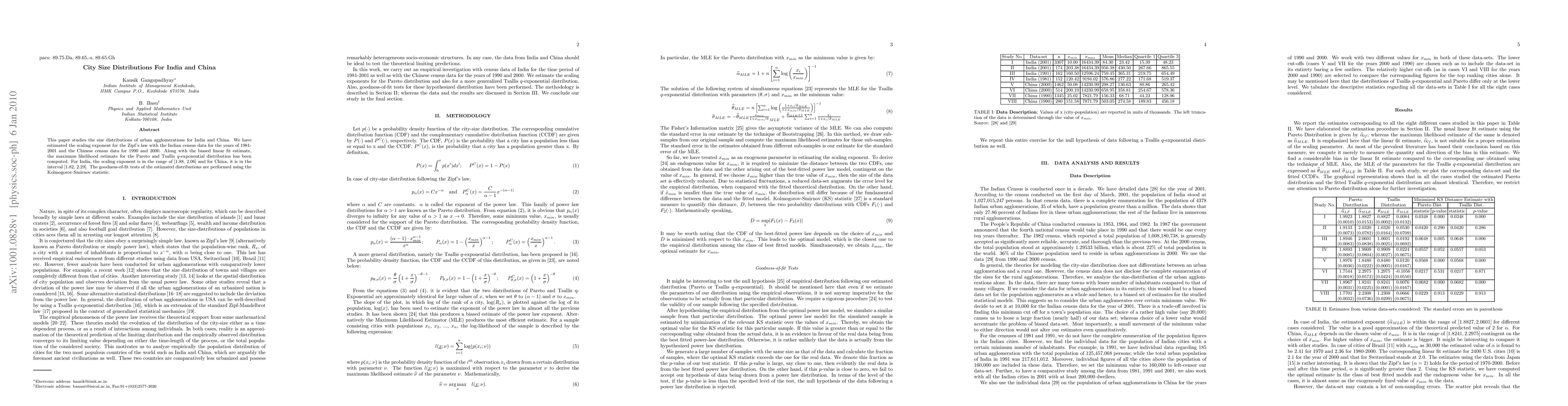 This paper studies the size distributions of urban agglomerations for India and China. We have estimated the scaling exponent for the Zipf's law with the Indian census data for the years of 1981-2001 and the Chinese census data for 1990 and 2000. Along with the biased linear fit estimate, the maximum likelihood estimate for the Pareto and Tsallis q-exponential distribution has been computed. For India, the scaling exponent is in the range of [1.88, 2.06] and for China, it is in the interval [1.82, 2.29]. The goodness-of-fit tests of the estimated distributions are performed using the Kolmogorov-Smirnov statistic.