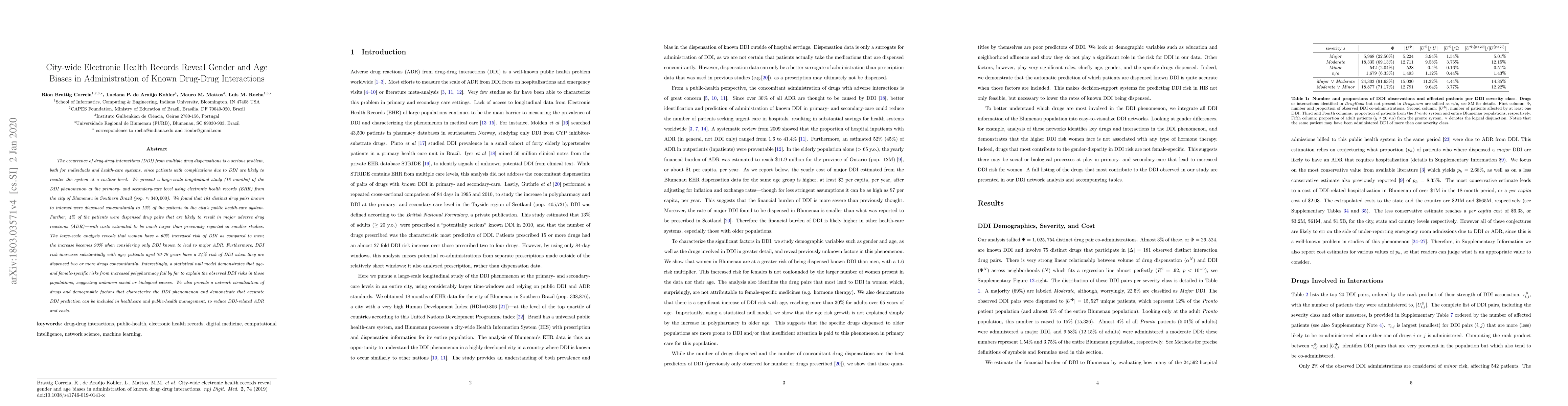 The occurrence of drug-drug-interactions (DDI) from multiple drug dispensations is a serious problem, both for individuals and health-care systems, since patients with complications due to DDI are likely to reenter the system at a costlier level. We present a large-scale longitudinal study (18 months) of the DDI phenomenon at the primary- and secondary-care level using electronic health records (EHR) from the city of Blumenau in Southern Brazil (pop. $\approx 340,000$). We found that 181 distinct drug pairs known to interact were dispensed concomitantly to 12\% of the patients in the city's public health-care system. Further, 4\% of the patients were dispensed drug pairs that are likely to result in major adverse drug reactions (ADR)---with costs estimated to be much larger than previously reported in smaller studies. The large-scale analysis reveals that women have a 60\% increased risk of DDI as compared to men; the increase becomes 90\% when considering only DDI known to lead to major ADR. Furthermore, DDI risk increases substantially with age; patients aged 70-79 years have a 34\% risk of DDI when they are dispensed two or more drugs concomitantly. Interestingly, a statistical null model demonstrates that age- and female-specific risks from increased polypharmacy fail by far to explain the observed DDI risks in those populations, suggesting unknown social or biological causes. We also provide a network visualization of drugs and demographic factors that characterize the DDI phenomenon and demonstrate that accurate DDI prediction can be included in healthcare and public-health management, to reduce DDI-related ADR and costs.