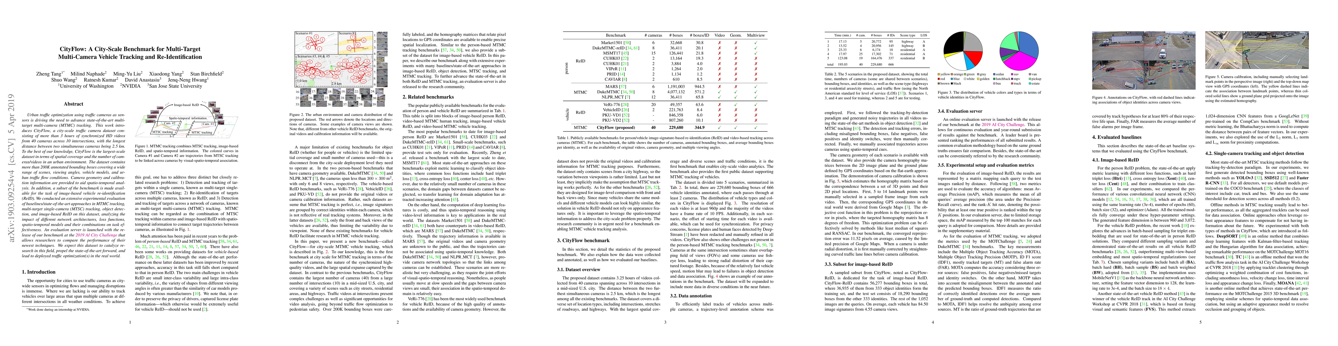 CityFlow is a large-scale city-wide dataset for multi-target multi-camera vehicle tracking and re-identification, featuring over 3 hours of synchronized HD videos from 40 cameras. It aims to advance urban traffic optimization and includes extensive experimental evaluations to benchmark state-of-the-art techniques.