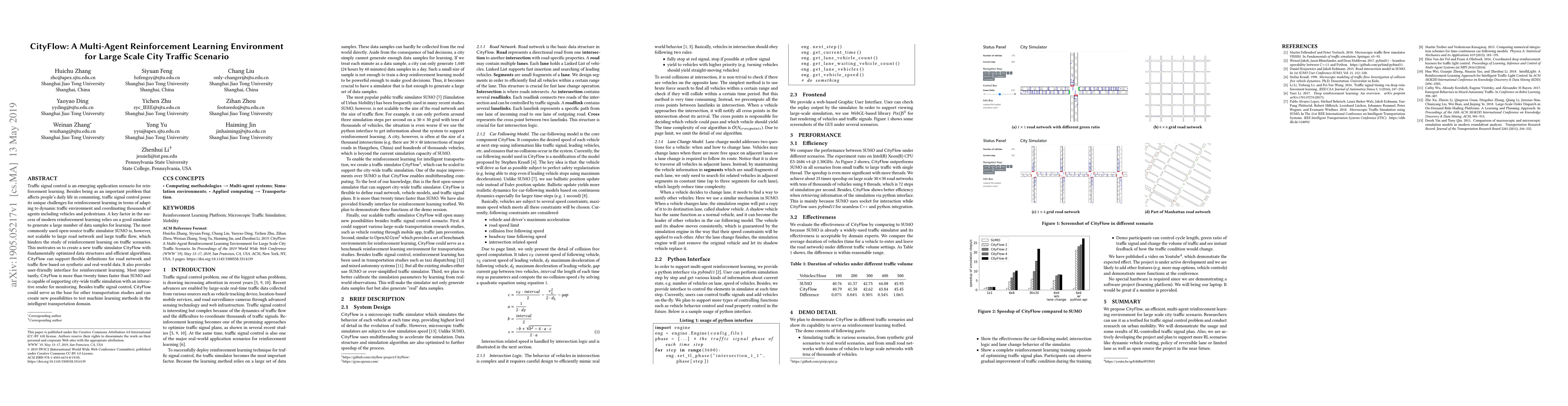 CityFlow is a new, highly scalable traffic simulator designed for large-scale city traffic scenarios, offering optimized data structures and algorithms for efficient reinforcement learning applications. It is over twenty times faster than SUMO and supports city-wide traffic simulations, making it ideal for traffic signal control and broader transportation studies.