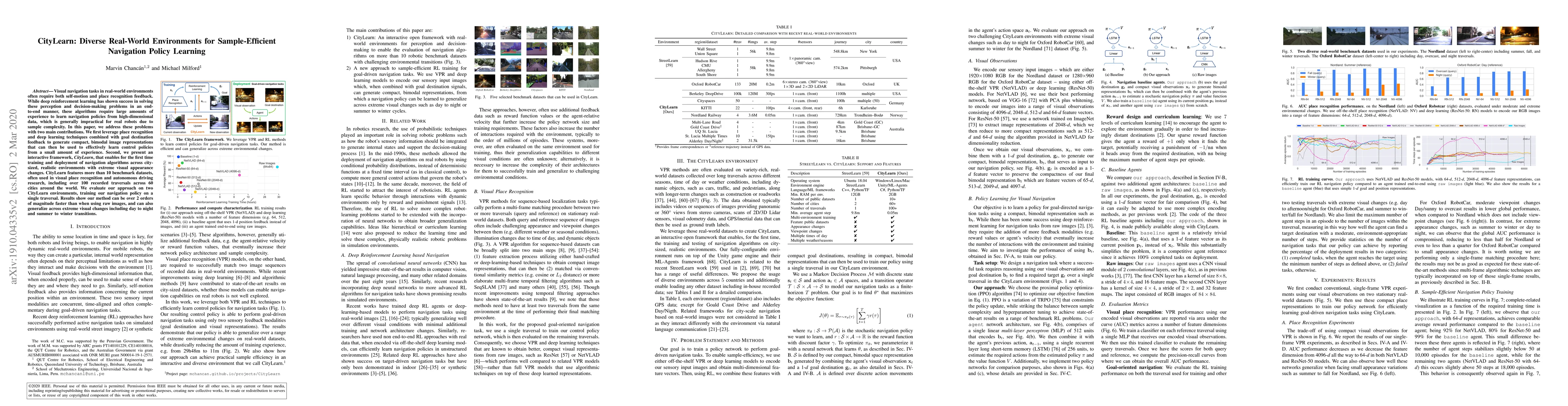 Visual navigation tasks in real-world environments often require both self-motion and place recognition feedback. While deep reinforcement learning has shown success in solving these perception and decision-making problems in an end-to-end manner, these algorithms require large amounts of experience to learn navigation policies from high-dimensional data, which is generally impractical for real robots due to sample complexity. In this paper, we address these problems with two main contributions. We first leverage place recognition and deep learning techniques combined with goal destination feedback to generate compact, bimodal image representations that can then be used to effectively learn control policies from a small amount of experience. Second, we present an interactive framework, CityLearn, that enables for the first time training and deployment of navigation algorithms across city-sized, realistic environments with extreme visual appearance changes. CityLearn features more than 10 benchmark datasets, often used in visual place recognition and autonomous driving research, including over 100 recorded traversals across 60 cities around the world. We evaluate our approach on two CityLearn environments, training our navigation policy on a single traversal. Results show our method can be over 2 orders of magnitude faster than when using raw images, and can also generalize across extreme visual changes including day to night and summer to winter transitions.