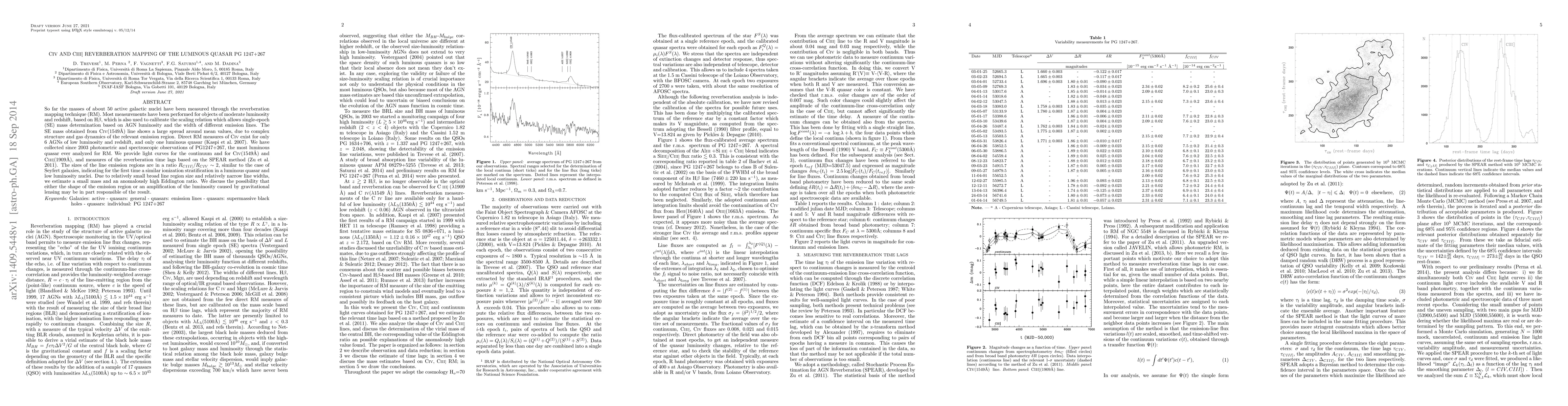 So far the masses of about 50 active galactic nuclei have been measured through the reverberation mapping technique (RM). Most measurements have been performed for objects of moderate luminosity and redshift, based on H$\beta$, which is also used to calibrate the scaling relation which allows single-epoch (SE) mass determination based on AGN luminosity and the width of different emission lines. The SE mass obtained from CIV$(1549 {\rm\AA})$ line shows a large spread around mean values, due to complex structure and gas dynamics of the relevant emission region. Direct RM measures of CIV exist for only 6 AGNs of low luminosity and redshift, and only one luminous quasar (Kaspi et al 2007). We have collected since 2003 photometric and spectroscopic observations of PG1247+267, the most luminous quasar ever analyzed for RM. We provide light curves for the continuum and for CIV$(1549 {\rm\AA})$ and CIII]$(1909{\rm\AA})$, and measures of the reverberation time lags based on the SPEAR method (Zu et al. 2011). The sizes of the line emission regions are in a ratio $R_{CIII]}/R_{CIV}\sim 2$, similar to the case of Seyfert galaxies, indicating for the first time a similar ionization stratification in a luminous quasar and low luminosity nuclei. Due to relatively small broad line region size and relatively narrow line widths, we estimate a small mass and an anomalously high Eddington ratio. We discuss the possibility that either the shape of the emission region or an amplification of the luminosity caused by gravitational lensing may be in part responsible of the result.