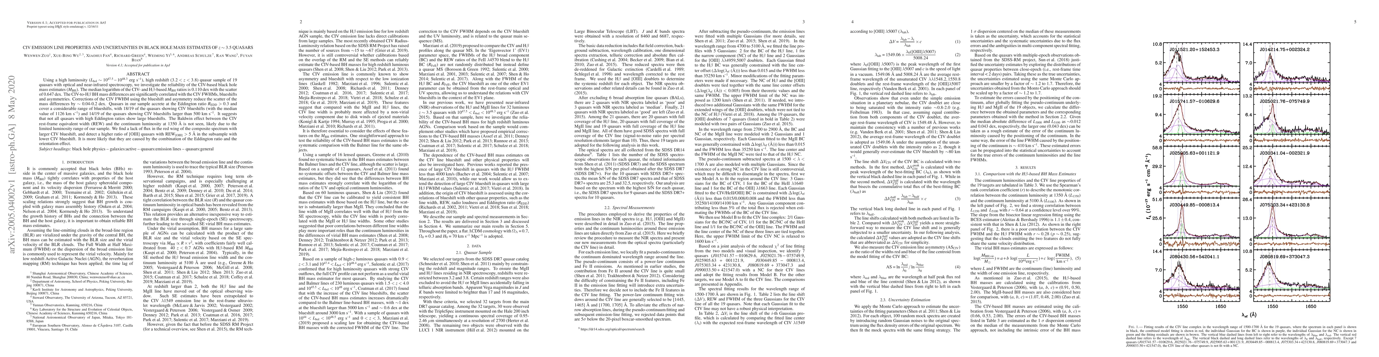 Using a high luminosity ($L_{\rm bol} \sim 10^{47.5} - 10^{48.3}$ erg s$^{-1}$), high redshift ($3.2 < z < 3.8$) quasar sample of 19 quasars with optical and near-infrared spectroscopy, we investigate the reliability of the CIV-based black hole mass estimates ($M_{\rm BH}$). The median logarithm of the CIV- and H$\beta$-based $M_{\rm BH}$ ratios is 0.110 dex with the scatter of 0.647 dex. The CIV-to-H$\beta$ BH mass differences are significantly correlated with the CIV FWHMs, blueshifts and asymmetries. Corrections of the CIV FWHM using the blueshift and asymmetry reduce the scatter of the mass differences by $\sim$ 0.04-0.2 dex. Quasars in our sample accrete at the Eddington ratio $R_{\rm EDD}>0.3$ and cover a considerable range of blueshifts, with 18/19 of the quasars showing CIV blueshifts (with the median value of 1126 km s$^{-1}$) and 14/19 of the quasars showing CIV blueshifts larger than 500 km s$^{-1}$. It suggests that not all quasars with high Eddington ratios show large blueshifts. The Baldwin effect between the CIV rest-frame equivalent width (REW) and the continuum luminosity at 1350 $\overset{\lower.5em\circ}{\mathrm{A}}$ is not seen, likely due to the limited luminosity range of our sample. We find a lack of flux in the red wing of the composite spectrum with larger CIV blueshift, and detect a higher ratio of [OIII] quasars with REW$_{\rm [OIII]}>5$ $\overset{\lower.5em\circ}{\mathrm{A}}$ in the subsample with lower CIV blueshift. It is more likely that they are caused by the combination of the Eddington ratio and the orientation effect.