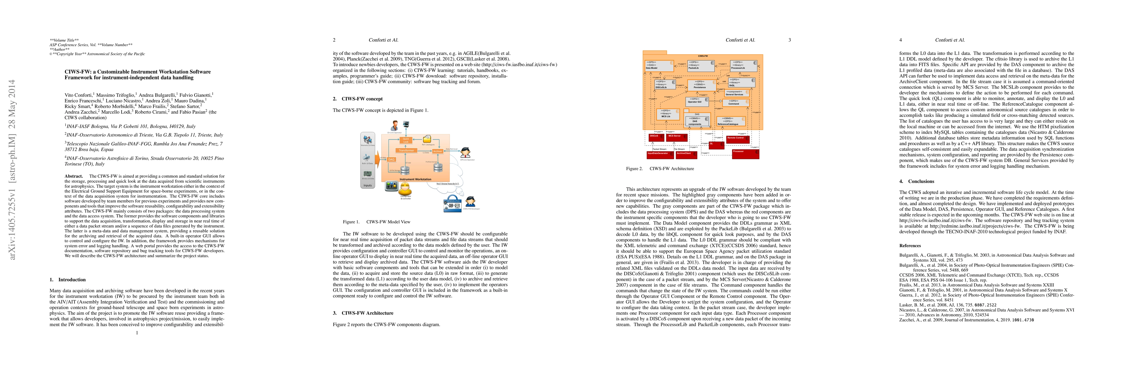 The CIWS-FW is aimed at providing a common and standard solution for the storage, processing and quick look at the data acquired from scientific instruments for astrophysics. The target system is the instrument workstation either in the context of the Electrical Ground Support Equipment for space-borne experiments, or in the context of the data acquisition system for instrumentation. The CIWS-FW core includes software developed by team members for previous experiments and provides new components and tools that improve the software reusability, configurability and extensibility attributes. The CIWS-FW mainly consists of two packages: the data processing system and the data access system. The former provides the software components and libraries to support the data acquisition, transformation, display and storage in near real time of either a data packet stream and/or a sequence of data files generated by the instrument. The latter is a meta-data and data management system, providing a reusable solution for the archiving and retrieval of the acquired data. A built-in operator GUI allows to control and configure the IW. In addition, the framework provides mechanisms for system error and logging handling. A web portal provides the access to the CIWS-FW documentation, software repository and bug tracking tools for CIWS-FW developers. We will describe the CIWS-FW architecture and summarize the project status.