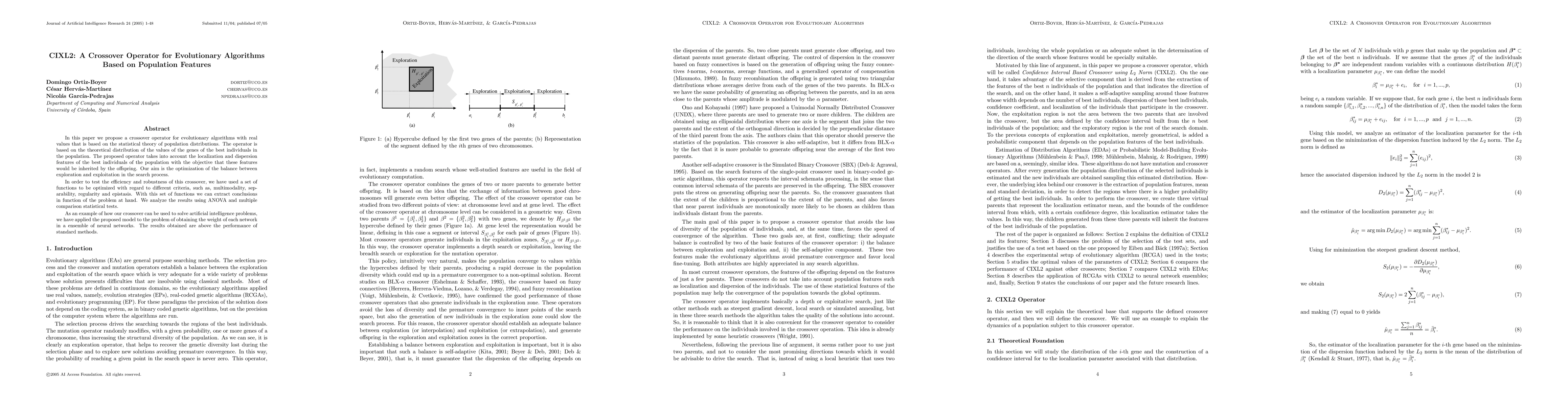 This paper introduces CIXL2, a novel crossover operator for evolutionary algorithms that leverages statistical population features to optimize the balance between exploration and exploitation. The operator is tested on various optimization functions and shows superior performance in neural network ensemble weight optimization.