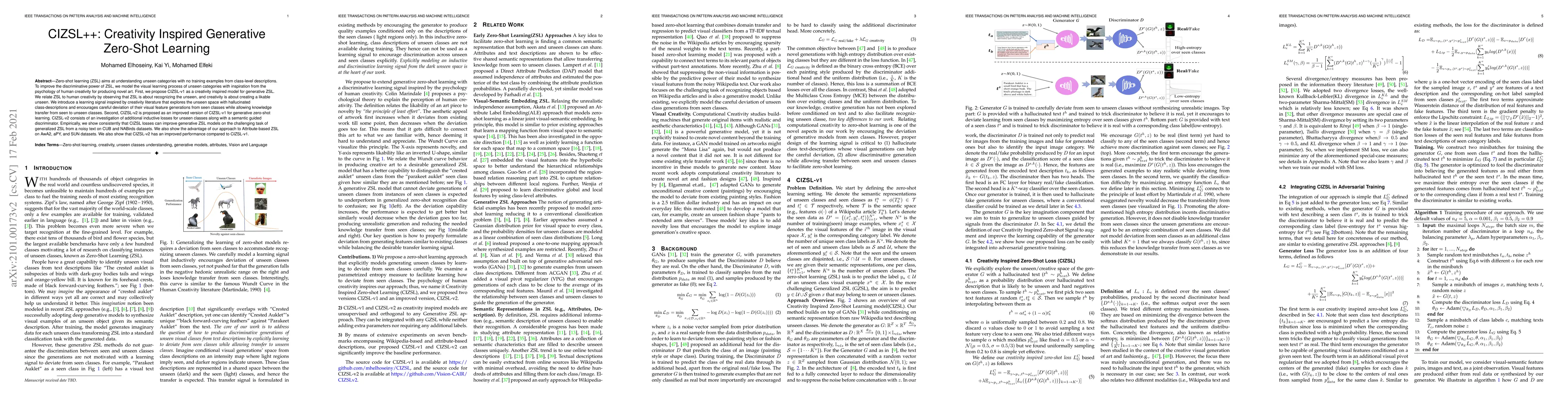 This paper proposes CIZSL-v1 and CIZSL-v2, creativity-inspired generative models for zero-shot learning, which leverage human creativity principles to enhance the recognition of unseen categories. CIZSL-v2 further improves CIZSL-v1 with additional inductive losses and a semantic guided discriminator, demonstrating superior performance on various zero-shot learning tasks.