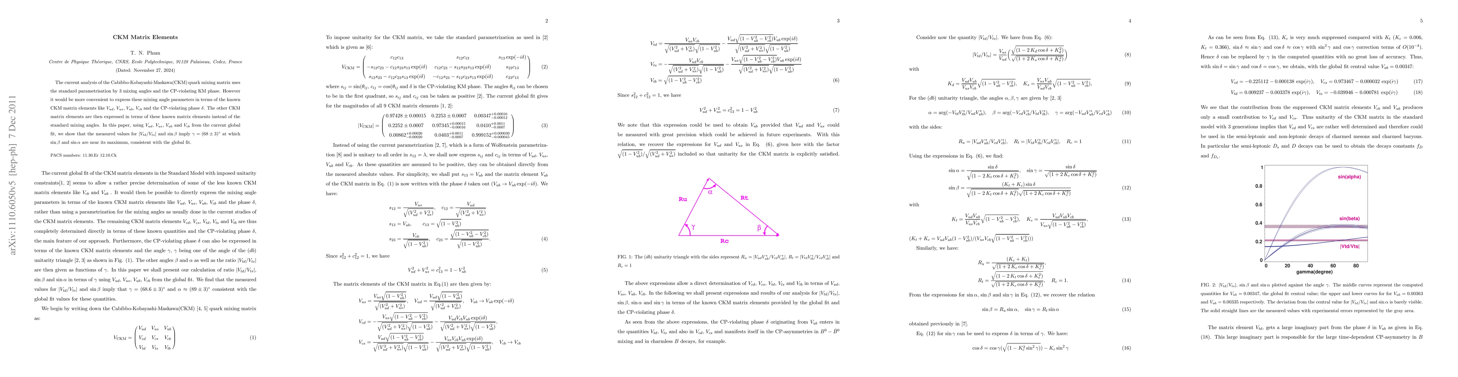 The current analysis of the Cabibbo-Kobayashi-Maskawa(CKM) quark mixing matrix uses the standard parametrisation by 3 mixing angles and the CP-violating KM phase. However it would be more convenient to express these mixing angle parameters in terms of the known CKM matrix elements like $V_{ud}$, $ V_{us}$, $ V_{ub}$, $V_{cb}$ and the CP-violating phase $\delta$. The other CKM matrix elements are then expressed in terms of these known matrix elements instead of the standard mixing angles. In this paper, using $V_{ud}$, $ V_{us}$, $ V_{ub}$ and $V_{cb}$ from the current global fit, we show that the measured values for $|V_{td}/V_{ts}|$ and $\sin\beta$ imply $\gamma=(68\pm 3)^{\circ}$ at which $\sin\beta$ and $\sin\alpha$ are near its maximum, consistent with the global fit.