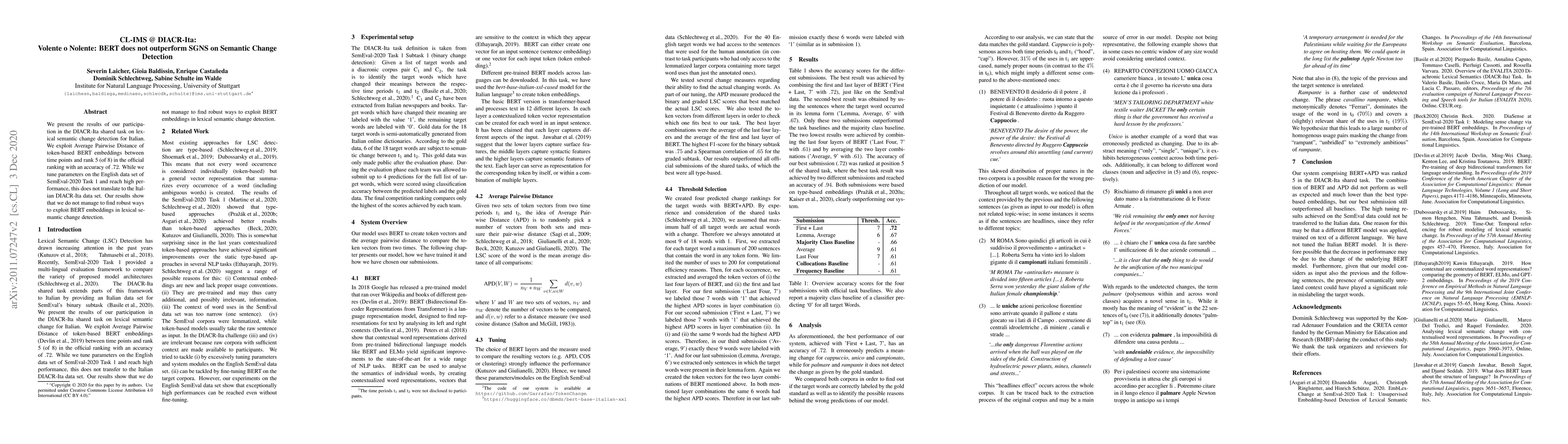 The paper reports on the authors' participation in the DIACR-Ita shared task for Italian lexical semantic change detection, where BERT embeddings did not outperform SGNS, ranking 5th with 72% accuracy. Despite achieving high performance on English SemEval-2020 data, the method failed to generalize effectively to the Italian dataset.