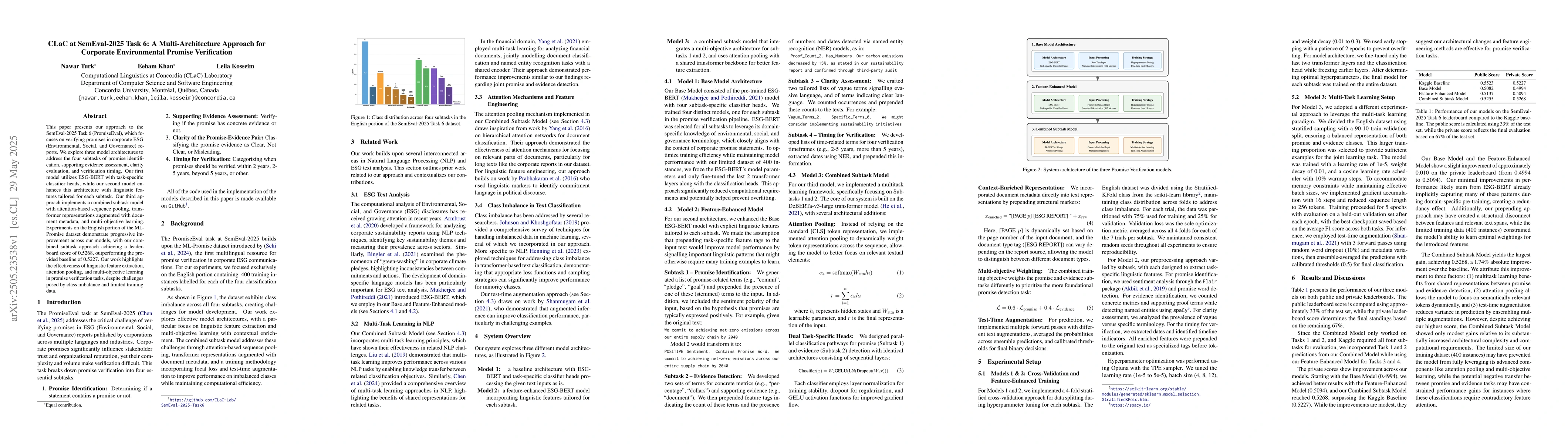 This paper presents our approach to the SemEval-2025 Task~6 (PromiseEval), which focuses on verifying promises in corporate ESG (Environmental, Social, and Governance) reports. We explore three model architectures to address the four subtasks of promise identification, supporting evidence assessment, clarity evaluation, and verification timing. Our first model utilizes ESG-BERT with task-specific classifier heads, while our second model enhances this architecture with linguistic features tailored for each subtask. Our third approach implements a combined subtask model with attention-based sequence pooling, transformer representations augmented with document metadata, and multi-objective learning. Experiments on the English portion of the ML-Promise dataset demonstrate progressive improvement across our models, with our combined subtask approach achieving a leaderboard score of 0.5268, outperforming the provided baseline of 0.5227. Our work highlights the effectiveness of linguistic feature extraction, attention pooling, and multi-objective learning in promise verification tasks, despite challenges posed by class imbalance and limited training data.