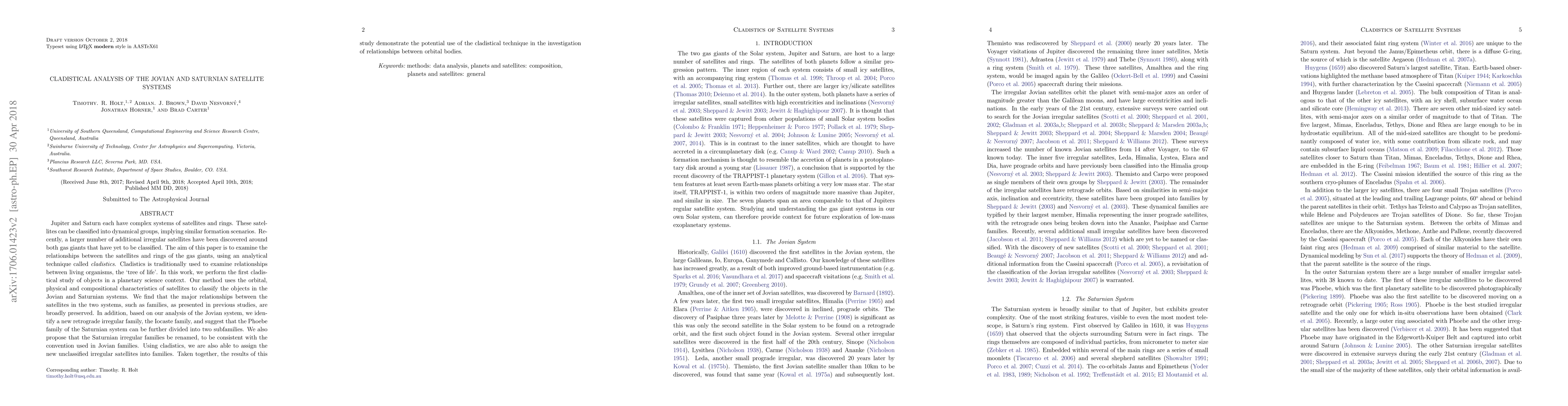 This paper applies cladistics, a method traditionally used in biology, to classify the satellites of Jupiter and Saturn based on their orbital, physical, and compositional characteristics. The study identifies new satellite families and proposes renaming and subdividing existing families, demonstrating the technique's potential in planetary science.