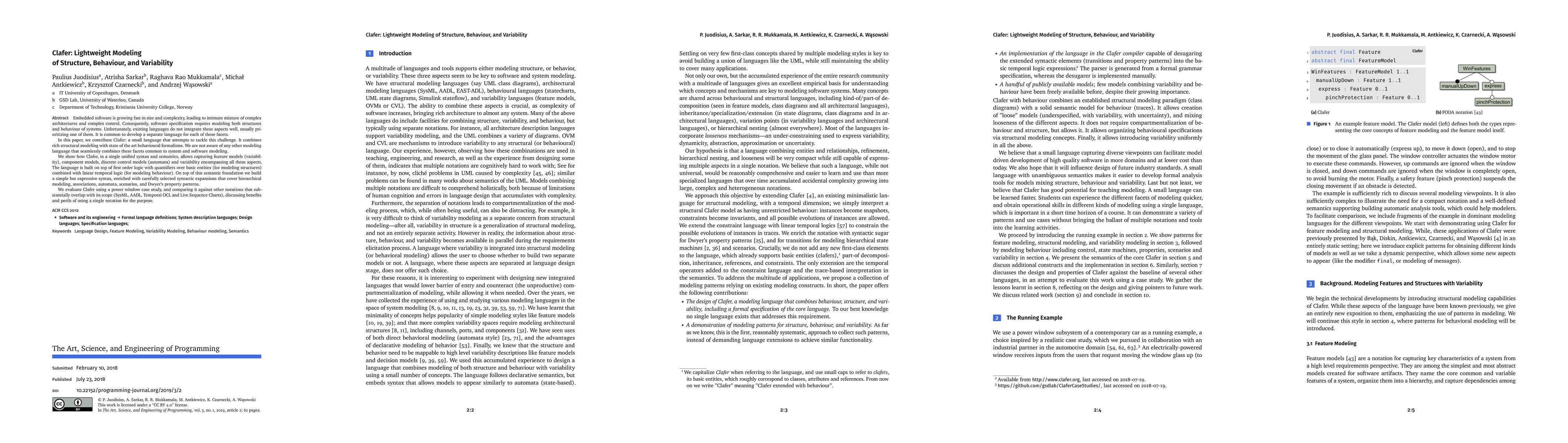 Clafer is a lightweight modeling language that integrates structural and behavioral aspects of embedded software systems, combining structural modeling with state-of-the-art behavioral formalisms. It uses first-order logic and linear temporal logic to provide a unified syntax for feature, component, and control models, evaluated through a power window case study.