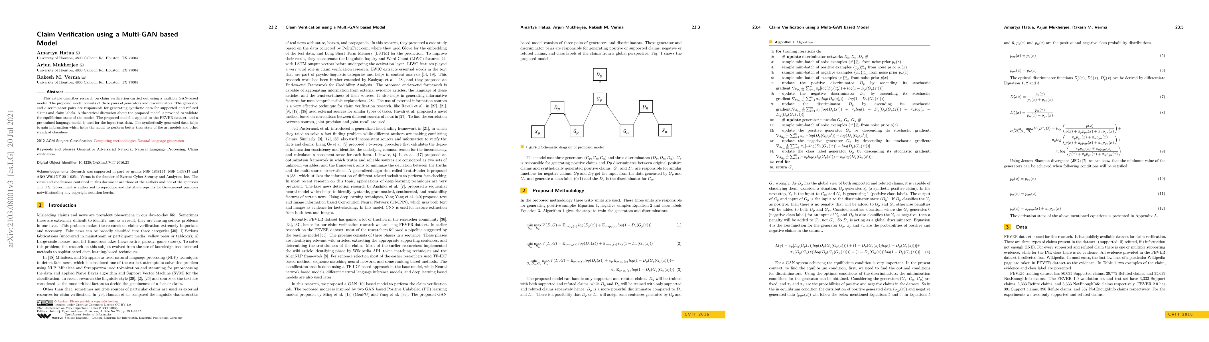 This article describes research on claim verification carried out using a multiple GAN-based model. The proposed model consists of three pairs of generators and discriminators. The generator and discriminator pairs are responsible for generating synthetic data for supported and refuted claims and claim labels. A theoretical discussion about the proposed model is provided to validate the equilibrium state of the model. The proposed model is applied to the FEVER dataset, and a pre-trained language model is used for the input text data. The synthetically generated data helps to gain information which helps the model to perform better than state of the art models and other standard classifiers.