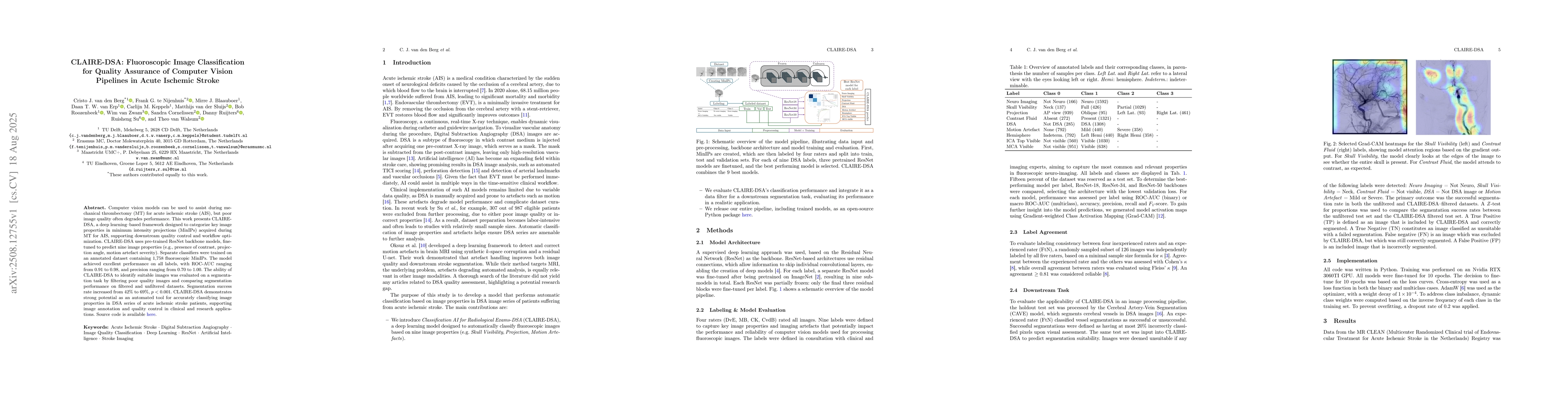 Computer vision models can be used to assist during mechanical thrombectomy (MT) for acute ischemic stroke (AIS), but poor image quality often degrades performance. This work presents CLAIRE-DSA, a deep learning--based framework designed to categorize key image properties in minimum intensity projections (MinIPs) acquired during MT for AIS, supporting downstream quality control and workflow optimization. CLAIRE-DSA uses pre-trained ResNet backbone models, fine-tuned to predict nine image properties (e.g., presence of contrast, projection angle, motion artefact severity). Separate classifiers were trained on an annotated dataset containing $1,758$ fluoroscopic MinIPs. The model achieved excellent performance on all labels, with ROC-AUC ranging from $0.91$ to $0.98$, and precision ranging from $0.70$ to $1.00$. The ability of CLAIRE-DSA to identify suitable images was evaluated on a segmentation task by filtering poor quality images and comparing segmentation performance on filtered and unfiltered datasets. Segmentation success rate increased from $42%$ to $69%$, $p < 0.001$. CLAIRE-DSA demonstrates strong potential as an automated tool for accurately classifying image properties in DSA series of acute ischemic stroke patients, supporting image annotation and quality control in clinical and research applications. Source code is available at https://gitlab.com/icai-stroke-lab/wp3_neurointerventional_ai/claire-dsa.