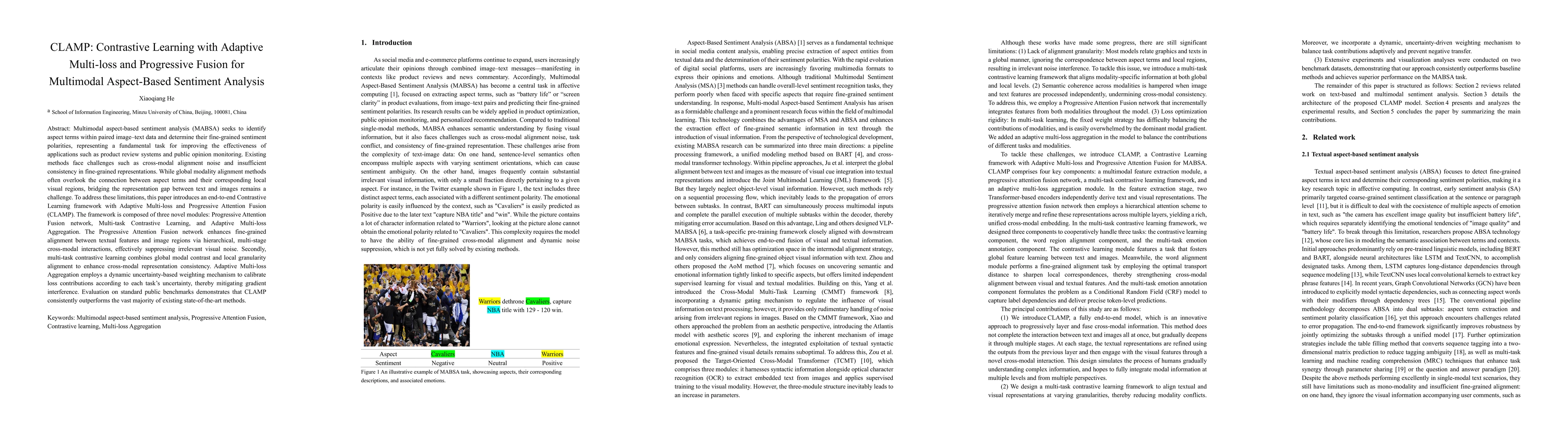 The paper introduces CLAMP, a contrastive learning framework for multimodal aspect-based sentiment analysis. CLAMP consists of three modules: Progressive Attention Fusion for fine-grained alignment, Multi-task Contrastive Learning for modal consistency, and Adaptive Multi-loss Aggregation for dynamic loss calibration. Evaluations show CLAMP outperforms existing methods in MABSA tasks.