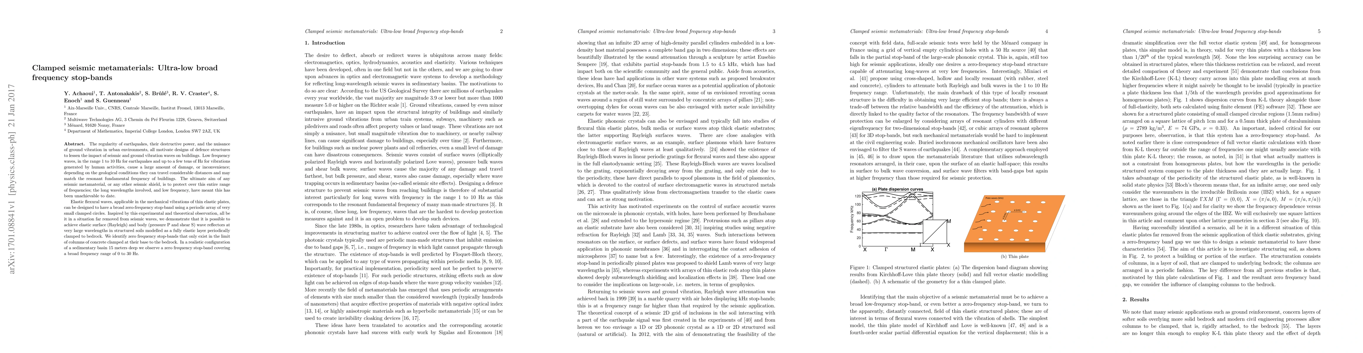 This paper explores the design of clamped seismic metamaterials to create ultra-low broad frequency stop-bands, aiming to mitigate the impact of low-frequency seismic and ground vibration waves. The study demonstrates the potential of structured soils, modeled as elastic layers clamped to bedrock, to reflect elastic surface and body waves over a wide frequency range, achieving a zero-frequency stop-band from 0 to 30 Hz in a 15-meter deep sedimentary basin.