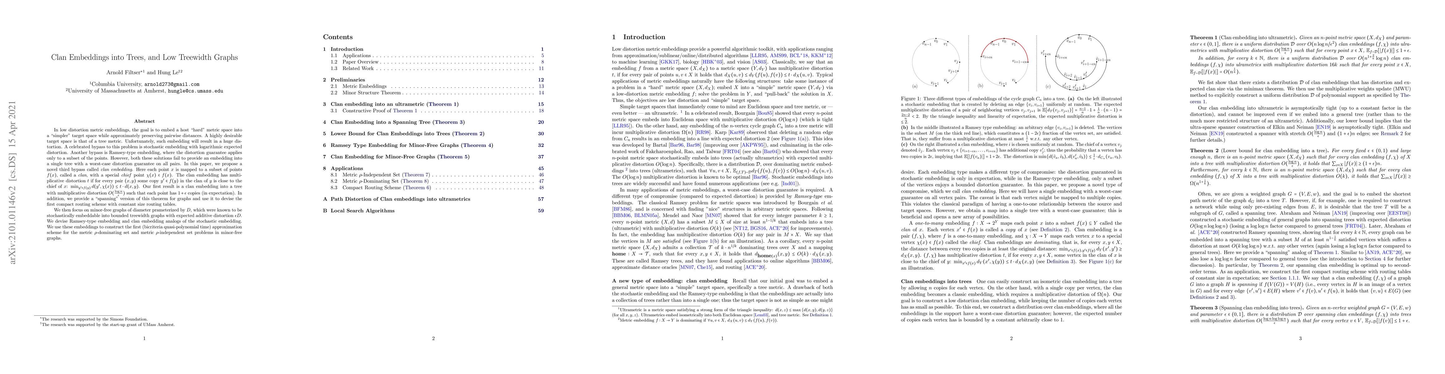 This paper introduces a novel "clan embedding" technique to achieve low distortion metric embeddings into trees and low treewidth graphs. The proposed method embeds each point into a subset of points with a chief point, achieving multiplicative distortion while maintaining a compact routing scheme and constructing approximation schemes for metric dominating set problems in minor-free graphs.