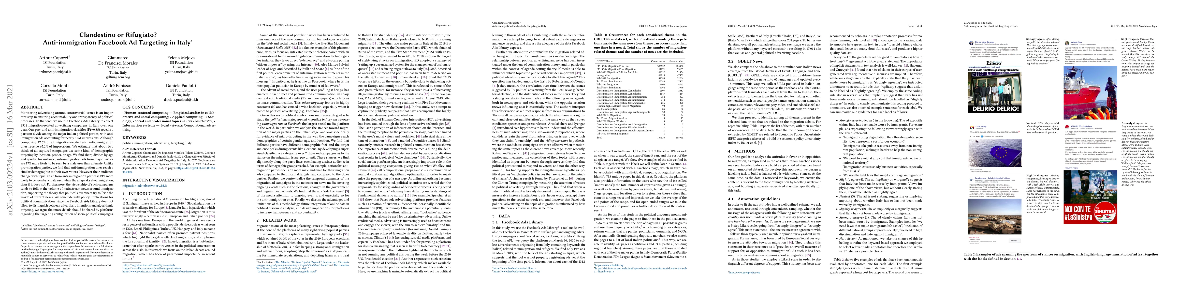 Monitoring advertising around controversial issues is an important step in ensuring accountability and transparency of political processes. To that end, we use the Facebook Ads Library to collect 2312 migration-related advertising campaigns in Italy over one year. Our pro- and anti-immigration classifier (F1=0.85) reveals a partisan divide among the major Italian political parties, with anti-immigration ads accounting for nearly 15M impressions. Although composing 47.6% of all migration-related ads, anti-immigration ones receive 65.2% of impressions. We estimate that about two thirds of all captured campaigns use some kind of demographic targeting by location, gender, or age. We find sharp divides by age and gender: for instance, anti-immigration ads from major parties are 17% more likely to be seen by a male user than a female. Unlike pro-migration parties, we find that anti-immigration ones reach a similar demographic to their own voters. However their audience change with topic: an ad from anti-immigration parties is 24% more likely to be seen by a male user when the ad speaks about migration, than if it does not. Furthermore, the viewership of such campaigns tends to follow the volume of mainstream news around immigration, supporting the theory that political advertisers try to "ride the wave" of current news. We conclude with policy implications for political communication: since the Facebook Ads Library does not allow to distinguish between advertisers intentions and algorithmic targeting, we argue that more details should be shared by platforms regarding the targeting configuration of socio-political campaigns.
