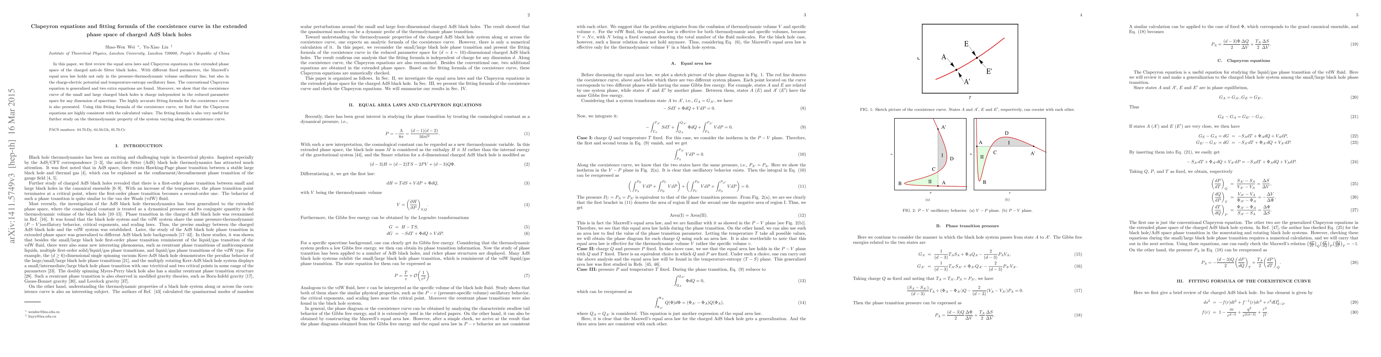 In this paper, we first review the equal area laws and Clapeyron equations in the extended phase space of the charged anti-de Sitter black holes. With different fixed parameters, the Maxwell's equal area law holds not only in the pressure-thermodynamic volume oscillatory line, but also in the charge-electric potential and temperature-entropy oscillatory lines. The conventional Clapeyron equation is generalized and two extra equations are found. Moreover, we show that the coexistence curve of the small and large charged black holes is charge independent in the reduced parameter space for any dimension of spacetime. The highly accurate fitting formula for the coexistence curve is also presented. Using this fitting formula of the coexistence curve, we find that the Clapeyron equations are highly consistent with the calculated values. The fitting formula is also very useful for further study on the thermodynamic property of the system varying along the coexistence curve.