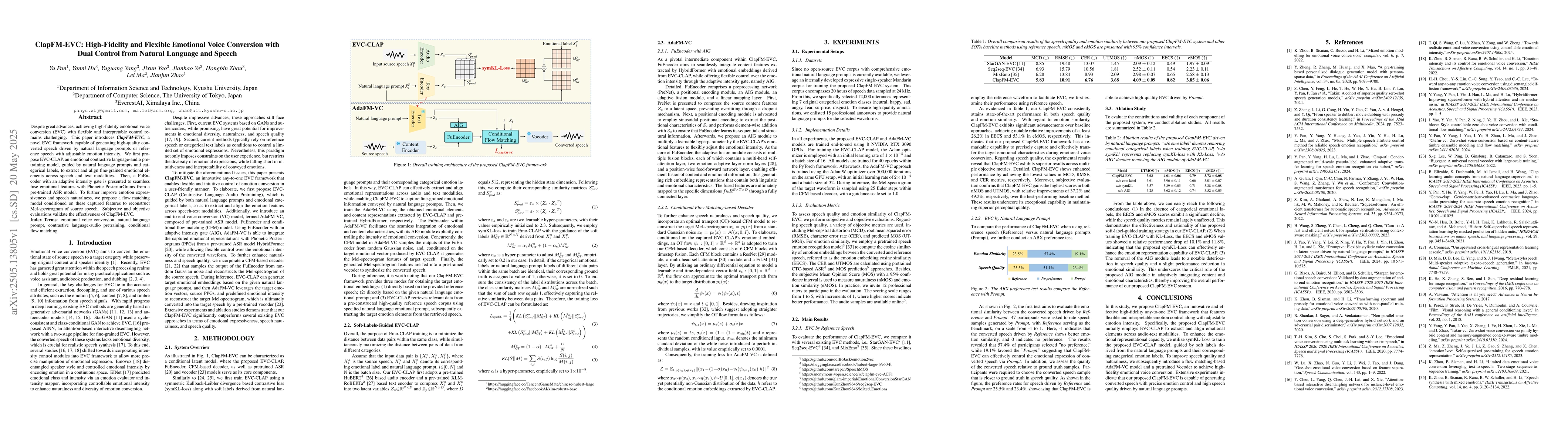 A new voice conversion framework, ClapFM-EVC, achieves high-quality emotional speech with flexible control from natural language prompts or reference speech. It combines pre-training, fusion, and flow matching to improve emotion expressiveness and speech naturalness.