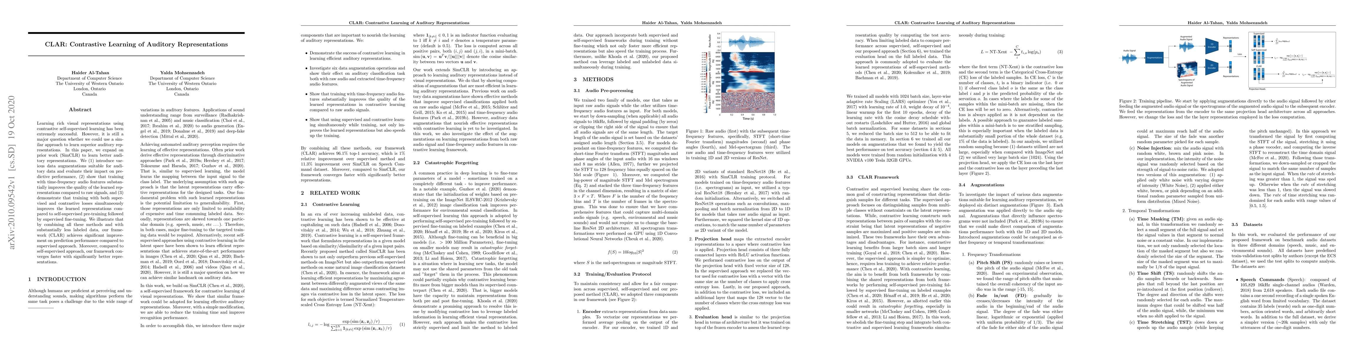 Learning rich visual representations using contrastive self-supervised learning has been extremely successful. However, it is still a major question whether we could use a similar approach to learn superior auditory representations. In this paper, we expand on prior work (SimCLR) to learn better auditory representations. We (1) introduce various data augmentations suitable for auditory data and evaluate their impact on predictive performance, (2) show that training with time-frequency audio features substantially improves the quality of the learned representations compared to raw signals, and (3) demonstrate that training with both supervised and contrastive losses simultaneously improves the learned representations compared to self-supervised pre-training followed by supervised fine-tuning. We illustrate that by combining all these methods and with substantially less labeled data, our framework (CLAR) achieves significant improvement on prediction performance compared to supervised approach. Moreover, compared to self-supervised approach, our framework converges faster with significantly better representations.