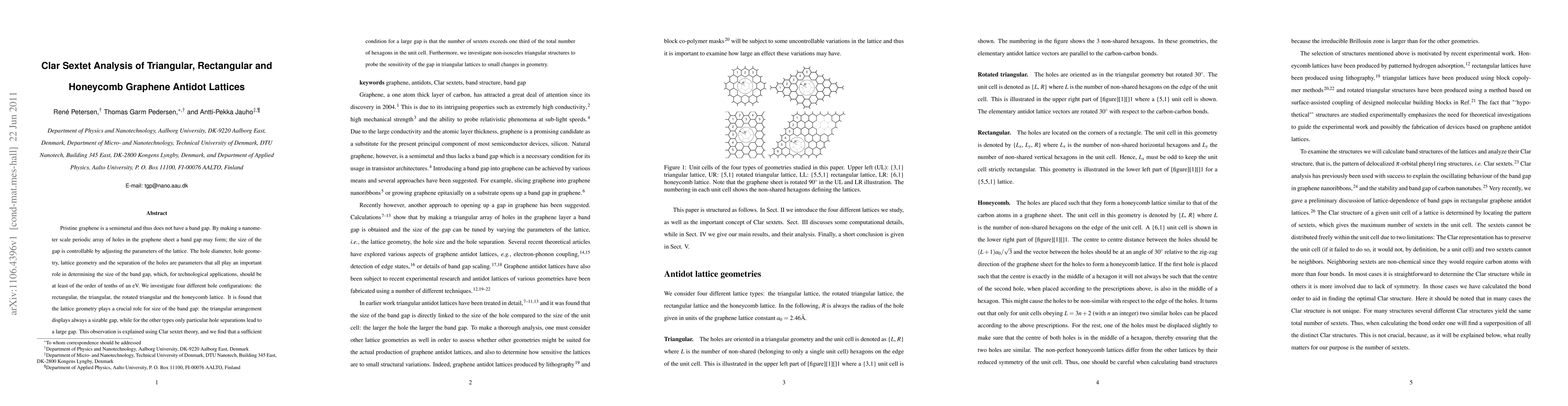 Pristine graphene is a semimetal and thus does not have a band gap. By making a nanometer scale periodic array of holes in the graphene sheet a band gap may form; the size of the gap is controllable by adjusting the parameters of the lattice. The hole diameter, hole geometry, lattice geometry and the separation of the holes are parameters that all play an important role in determining the size of the band gap, which, for technological applications, should be at least of the order of tenths of an eV. We investigate four different hole configurations: the rectangular, the triangular, the rotated triangular and the honeycomb lattice. It is found that the lattice geometry plays a crucial role for size of the band gap: the triangular arrangement displays always a sizable gap, while for the other types only particular hole separations lead to a large gap. This observation is explained using Clar sextet theory, and we find that a sufficient condition for a large gap is that the number of sextets exceeds one third of the total number of hexagons in the unit cell. Furthermore, we investigate non-isosceles triangular structures to probe the sensitivity of the gap in triangular lattices to small changes in geometry.