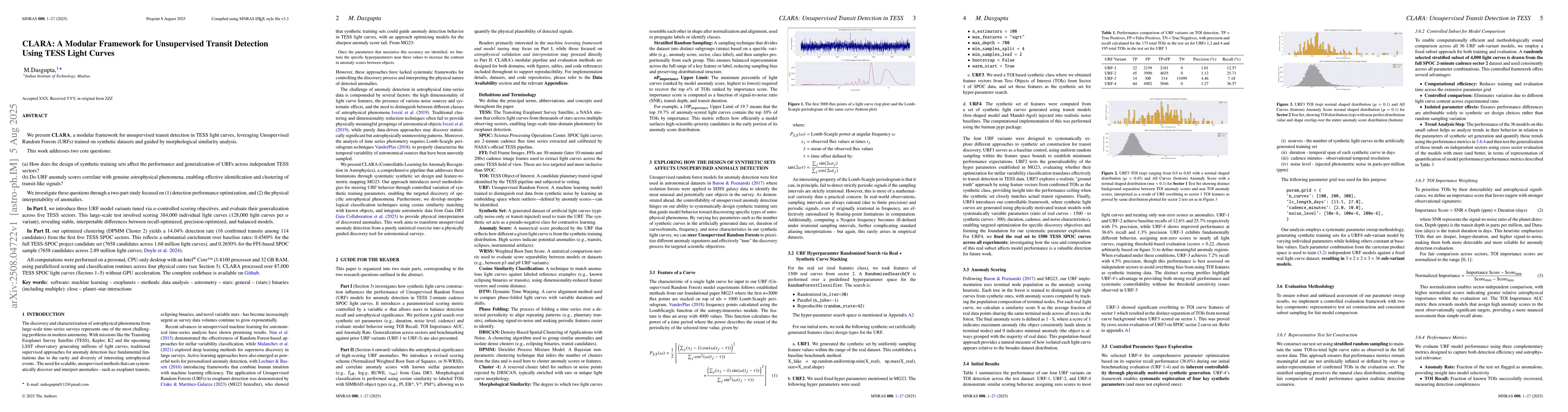 We present CLARA, a modular framework for unsupervised transit detection in TESS light curves, leveraging Unsupervised Random Forests (URFs) trained on synthetic datasets and guided by morphological similarity analysis. This work addresses two core questions: (a) How does the design of synthetic training sets affect the performance and generalization of URFs across independent TESS sectors? (b) Do URF anomaly scores correlate with genuine astrophysical phenomena, enabling effective identification and clustering of transit-like signals? We investigate these questions through a two-part study focused on (1) detection performance optimization, and (2) the physical interpretability of anomalies. In Part I, we introduce three URF model variants tuned via alpha-controlled scoring objectives, and evaluate their generalization across five TESS sectors. This large-scale test involved scoring 384,000 individual light curves (128,000 light curves per alpha variant), revealing stable, interpretable differences between recall-optimized, precision-optimized, and balanced models. In Part II, our optimized clustering (DPMM Cluster 2) yields a 14.04% detection rate (16 confirmed transits among 114 candidates) from the first five TESS SPOC sectors. This reflects a substantial enrichment over baseline rates: 0.4569% for the full TESS-SPOC project candidate set (7658 candidates across 1.68 million light curves), and 0.2650% for the FFI-based SPOC sample (7658 candidates across 2.89 million light curves;). All computations were performed on a personal, CPU-only desktop with an Intel Core i3-8100 processor and 32 GB RAM, using parallelized scoring and classification routines across four physical cores. CLARA processed over 87,000 TESS SPOC light curves (Sectors 1-5) without GPU acceleration in Part-II.