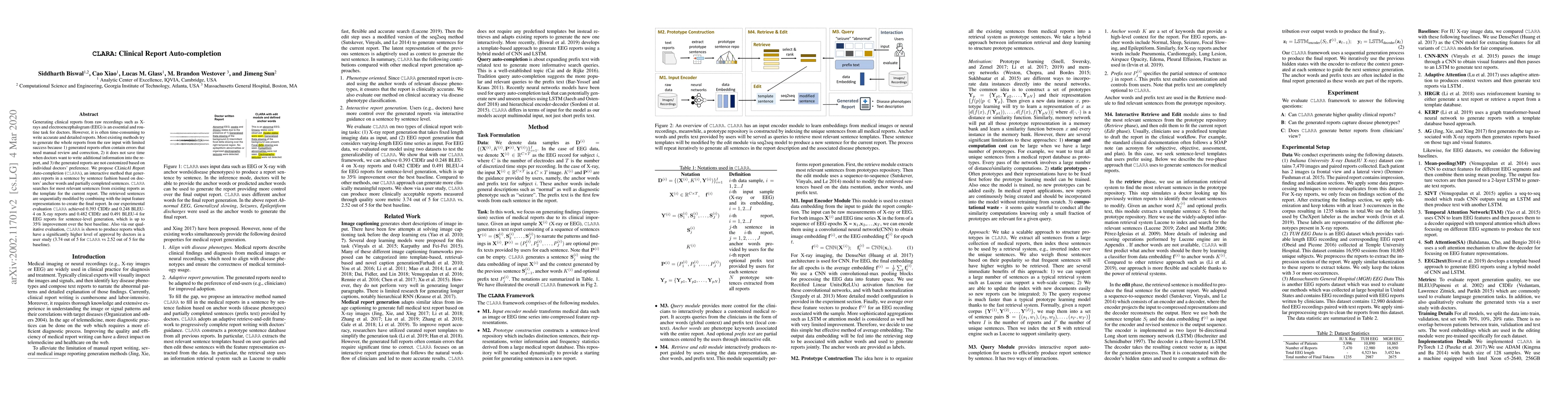 CLARA is an interactive method for auto-completing clinical reports by generating sentences based on doctors' input and existing templates, improving report accuracy and efficiency. Experimental results show up to 35% improvement over baselines and higher doctor approval ratings.