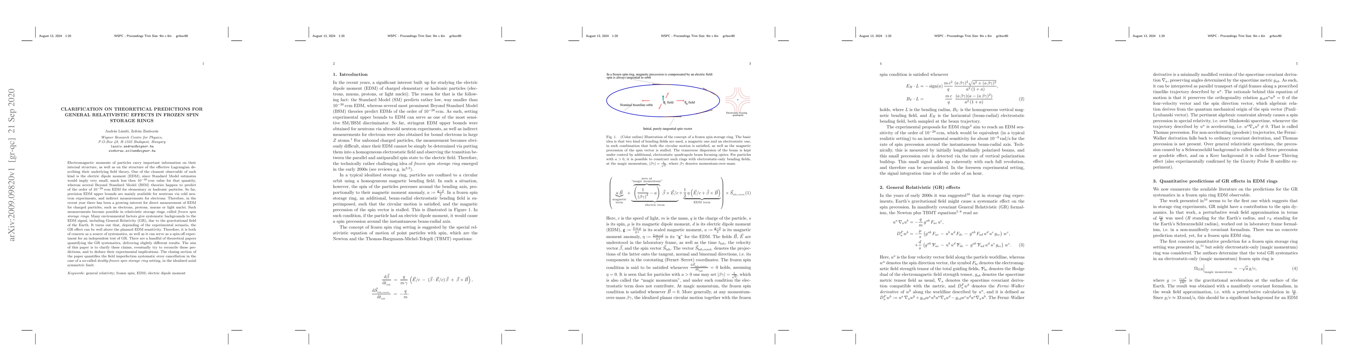 This paper aims to clarify theoretical predictions for general relativistic effects in frozen spin storage rings, which are used to measure the electric dipole moment (EDM) of particles. It reconciles differing theoretical claims and discusses their implications for EDM experiments, also quantifying systematic error cancellation in an idealized setting.